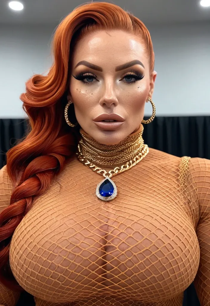 Generate Gorgeous female boss , bimbo , hourglass body , abnormally massive female bodybuilder , gorgeous , close up , full lips , big booty , redheaded , freckles on face and breast , braided design hair , feminine silhouette , too big breast , big booty , sexy thighs abs , silhouette , up close , flexing biceps , beautiful green eyes , legs are iconic and defining physical feature , both visually and in terms of combat ability.wearing an outfit that is a striking blend of elegance , power , and femininity , designed to command attention in any room. The suit is tailored to perfection , hugging the wearer’s curves with precision while emphasizing a structured silhouette. The fabric itself is a refined grey tweed patterned with subtle white grid lines , giving the suit a texture that feels both sophisticated and modern. The blazer features broad blue lapels and gold button accents , adding a luxurious touch that elevates the look beyond typical business attire. The matching high-waisted trousers elongate the frame , further enhancing the poised and commanding effect of the ensemble.The styling choices amplify the boldness of the suit. The inner blouse is a silky , greybutton-down shirt that complements the tweed’s tone while introducing a softer , feminine balance to the sharp tailoring of the jacket. The blouse peeks out neatly from under the blazer , maintaining elegance without drawing focus away from the suit’s commanding cut. Accessories are kept minimal yet intentional: a delicate layered gold necklace and hoop earrings that add glimmers of light and luxury without overpowering the outfit. The choice of voluminous , honey-brown braids cascading down her shoulders frames the face with both confidence and glamour , completing the commanding visual.Altogether , this look communicates a blend of authority and allure. It is business-ready yet fashion-forward , balancing corporate structure with vibrant femininity. The color palette blue , grey and gold avoids being overly delicate , instead embracing the richness of texture , structure , and presence. This is the kind of ensemble that speaks to ambition , sophistication , and personal style—ideal for someone who thrives in positions of influence but insists on expressing her individuality with bold elegance. It’s not just clothing—it’s a statement of power wrapped in grace. In luxury living legs that could crush a watermelon , skirt high boots are a bold and striking statement piece , crafted in glossy black patent leather that gives them a sleek , polished finish. Rising to just below the knee , the boots feature three adjustable buckle straps along the shaft , adding both edge and detail to their design. The towering stiletto heel , paired with a thick platform sole , creates an ultra-dramatic silhouette that elongates the leg and exudes power and confidence. With their combination of shine , height , and structure , these boots perfectly balance fierce femininity with high-fashion allure. Turtleneck-dress , gold and sapphire necklace , ,