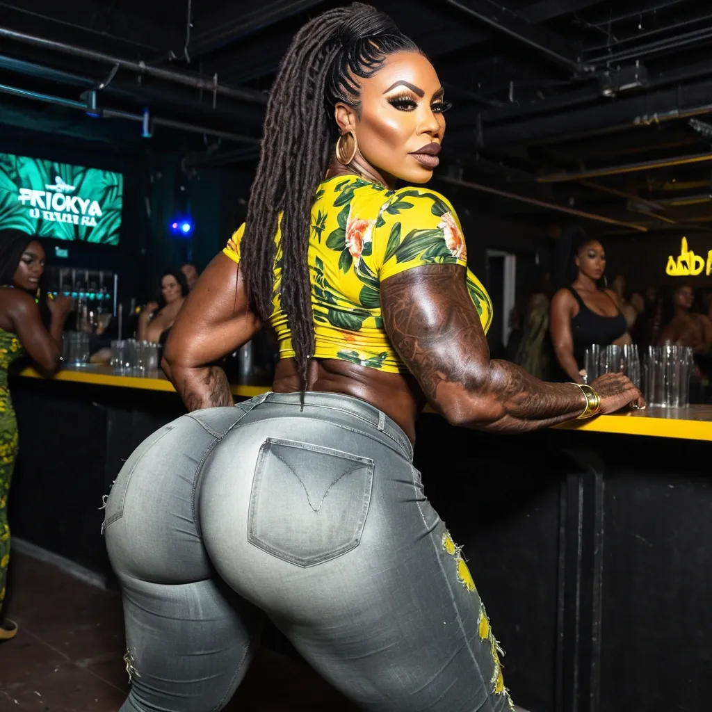 Generate Gorgeous female boss , 42 years old , , bimbo , dark-skinned African-American woman , , hourglass body , abnormally massive female bodybuilder , gorgeous , close up , full lips , big booty , brown , freckles on face and breast , dreadlocks , feminine silhouette , too big breast , big booty , sexy thighs abs , silhouette , up close , flexing biceps , gorgeous honey hazel eyes , legs are iconic and defining physical feature , both visually and in terms of combat ability.wearing an outfit that is a striking blend of elegance , power , and femininity , designed to command attention in any room. The suit is tailored to perfection , hugging the wearer’s curves with precision while emphasizing a structured silhouette. The fabric itself is a refined grey tweed patterned with subtle white grid lines , giving the suit a texture that feels both sophisticated and modern. The blazer features broad blue lapels and gold button accents , adding a luxurious touch that elevates the look beyond typical business attire. The matching high-waisted trousers elongate the frame , further enhancing the poised and commanding effect of the ensemble.The styling choices amplify the boldness of the suit. The inner blouse is a silky , greybutton-down shirt that complements the tweed’s tone while introducing a softer , feminine balance to the sharp tailoring of the jacket. The blouse peeks out neatly from under the blazer , maintaining elegance without drawing focus away from the suit’s commanding cut. Accessories are kept minimal yet intentional: a delicate layered gold necklace and hoop earrings that add glimmers of light and luxury without overpowering the outfit. The choice of voluminous , honey-brown braids cascading down her shoulders frames the face with both confidence and glamour , completing the commanding visual.Altogether , this look communicates a blend of authority and allure. It is business-ready yet fashion-forward , balancing corporate structure with vibrant femininity. The color palette blue , grey and gold avoids being overly delicate , instead embracing the richness of texture , structure , and presence. This is the kind of ensemble that speaks to ambition , sophistication , and personal style—ideal for someone who thrives in positions of influence but insists on expressing her individuality with bold elegance. It’s not just clothing—it’s a statement of power wrapped in grace. In luxury living legs that could crush a watermelon , skirt high boots are a bold and striking statement piece , crafted in glossy black patent leather that gives them a sleek , polished finish. Rising to just below the knee , the boots feature three adjustable buckle straps along the shaft , adding both edge and detail to their design. The towering stiletto heel , paired with a thick platform sole , creates an ultra-dramatic silhouette that elongates the leg and exudes power and confidence. With their combination of shine , height , and structure , these boots perfectly balance fierce femininity with high-fashion allure. Massive breast , massive cleavage , twerking in nightclub , dancing , hands on knees back arched , wearing a black , yellow and green floral t-shirt , gray denim pants , enormous butt ,