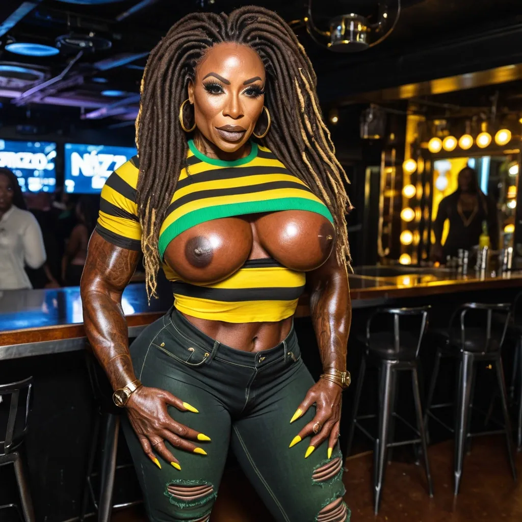 Generate Gorgeous female boss , 42 years old , , bimbo , dark-skinned African-American woman , , hourglass body , abnormally massive female bodybuilder , gorgeous , close up , full lips , big booty , brown , freckles on face and breast , dreadlocks , feminine silhouette , too big breast , big booty , sexy thighs abs , silhouette , up close , flexing biceps , gorgeous honey hazel eyes , legs are iconic and defining physical feature , both visually and in terms of combat ability.wearing an outfit that is a striking blend of elegance , power , and femininity , designed to command attention in any room. The suit is tailored to perfection , hugging the wearer’s curves with precision while emphasizing a structured silhouette. The fabric itself is a refined grey tweed patterned with subtle white grid lines , giving the suit a texture that feels both sophisticated and modern. The blazer features broad blue lapels and gold button accents , adding a luxurious touch that elevates the look beyond typical business attire. The matching high-waisted trousers elongate the frame , further enhancing the poised and commanding effect of the ensemble.The styling choices amplify the boldness of the suit. The inner blouse is a silky , greybutton-down shirt that complements the tweed’s tone while introducing a softer , feminine balance to the sharp tailoring of the jacket. The blouse peeks out neatly from under the blazer , maintaining elegance without drawing focus away from the suit’s commanding cut. Accessories are kept minimal yet intentional: a delicate layered gold necklace and hoop earrings that add glimmers of light and luxury without overpowering the outfit. The choice of voluminous , honey-brown braids cascading down her shoulders frames the face with both confidence and glamour , completing the commanding visual.Altogether , this look communicates a blend of authority and allure. It is business-ready yet fashion-forward , balancing corporate structure with vibrant femininity. The color palette blue , grey and gold avoids being overly delicate , instead embracing the richness of texture , structure , and presence. This is the kind of ensemble that speaks to ambition , sophistication , and personal style—ideal for someone who thrives in positions of influence but insists on expressing her individuality with bold elegance. It’s not just clothing—it’s a statement of power wrapped in grace. In luxury living legs that could crush a watermelon , skirt high boots are a bold and striking statement piece , crafted in glossy black patent leather that gives them a sleek , polished finish. Rising to just below the knee , the boots feature three adjustable buckle straps along the shaft , adding both edge and detail to their design. The towering stiletto heel , paired with a thick platform sole , creates an ultra-dramatic silhouette that elongates the leg and exudes power and confidence. With their combination of shine , height , and structure , these boots perfectly balance fierce femininity with high-fashion allure. Massive breast , massive cleavage , standing in jazz club , wearing a black , yellow and green striped t-shirt , black denim pants , enormous butt , sort finger nails ,