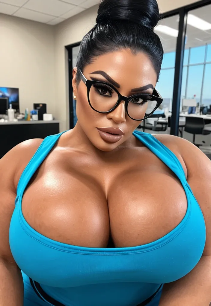 Generate Gorgeous female nurse , bimbo , hourglass body , golden brown skin complexion. abnormally massive female bodybuilder , gorgeous , close up , full lips , big booty , black hair , eye glasses , Philippine woman , black pompadour stylish hair , feminine silhouette , too big breast , big booty , sexy thighs abs , silhouette , up close , flexing biceps , beautiful green eyes , legs are iconic and defining physical feature , both visually and in terms of combat ability.wearing an outfit that is a striking blend of elegance , power , and femininity , designed to command attention in any room. The suit is tailored to perfection , hugging the wearer’s curves with precision while emphasizing a structured silhouette. The fabric itself is a refined grey tweed patterned with subtle white grid lines , giving the suit a texture that feels both sophisticated and modern. The blazer features broad blue lapels and gold button accents , adding a luxurious touch that elevates the look beyond typical business attire. The matching high-waisted trousers elongate the frame , further enhancing the poised and commanding effect of the ensemble.The styling choices amplify the boldness of the suit. The inner blouse is a silky , greybutton-down shirt that complements the tweed’s tone while introducing a softer , feminine balance to the sharp tailoring of the jacket. The blouse peeks out neatly from under the blazer , maintaining elegance without drawing focus away from the suit’s commanding cut. Accessories are kept minimal yet intentional: a delicate layered gold necklace and hoop earrings that add glimmers of light and luxury without overpowering the outfit. The choice of voluminous , honey-brown braids cascading down her shoulders frames the face with both confidence and glamour , completing the commanding visual.Altogether , this look communicates a blend of authority and allure. It is business-ready yet fashion-forward , balancing corporate structure with vibrant femininity. The color palette blue , grey and gold avoids being overly delicate , instead embracing the richness of texture , structure , and presence. This is the kind of ensemble that speaks to ambition , sophistication , and personal style—ideal for someone who thrives in positions of influence but insists on expressing her individuality with bold elegance. It’s not just clothing—it’s a statement of power wrapped in grace. In luxury living legs that could crush a watermelon , skirt high boots are a bold and striking statement piece , crafted in glossy black patent leather that gives them a sleek , polished finish. Rising to just below the knee , the boots feature three adjustable buckle straps along the shaft , adding both edge and detail to their design. The towering stiletto heel , paired with a thick platform sole , creates an ultra-dramatic silhouette that elongates the leg and exudes power and confidence. With their combination of shine , height , and structure , these boots perfectly balance fierce femininity with high-fashion allure. High cheekbones , prominent jawline , gorgeous big brown eyes , powerful curves , enormous breast , sitting at front desk , in blue scrubs , scrub top , scrub pants , voluptuous , up close shot , looking up at viewer , topical view , massive cleavage ,