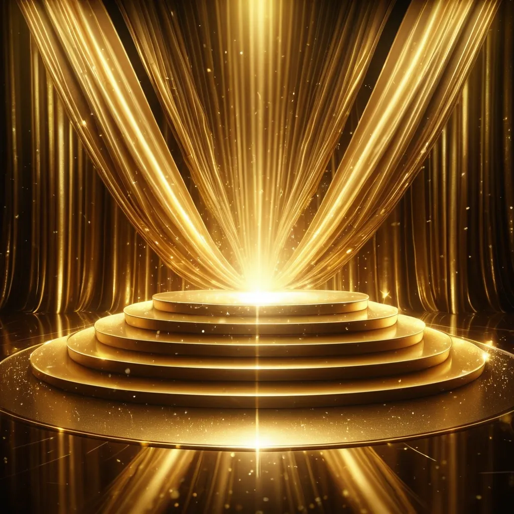 A luxurious golden stage background in widescreen format (1512x540). At the center is a glowing two-tier podium with smooth reflective surfaces. Golden beams of light radiate from above , cascading down like a spotlight , illuminating the podium. The background features elegant flowing drapery and shimmering particles , blending both dark golden tones and bright champagne highlights to create a rich , opulent atmosphere. The scene should feel majestic , cinematic , and perfect for a luxury banner or award ceremony stage design. ,