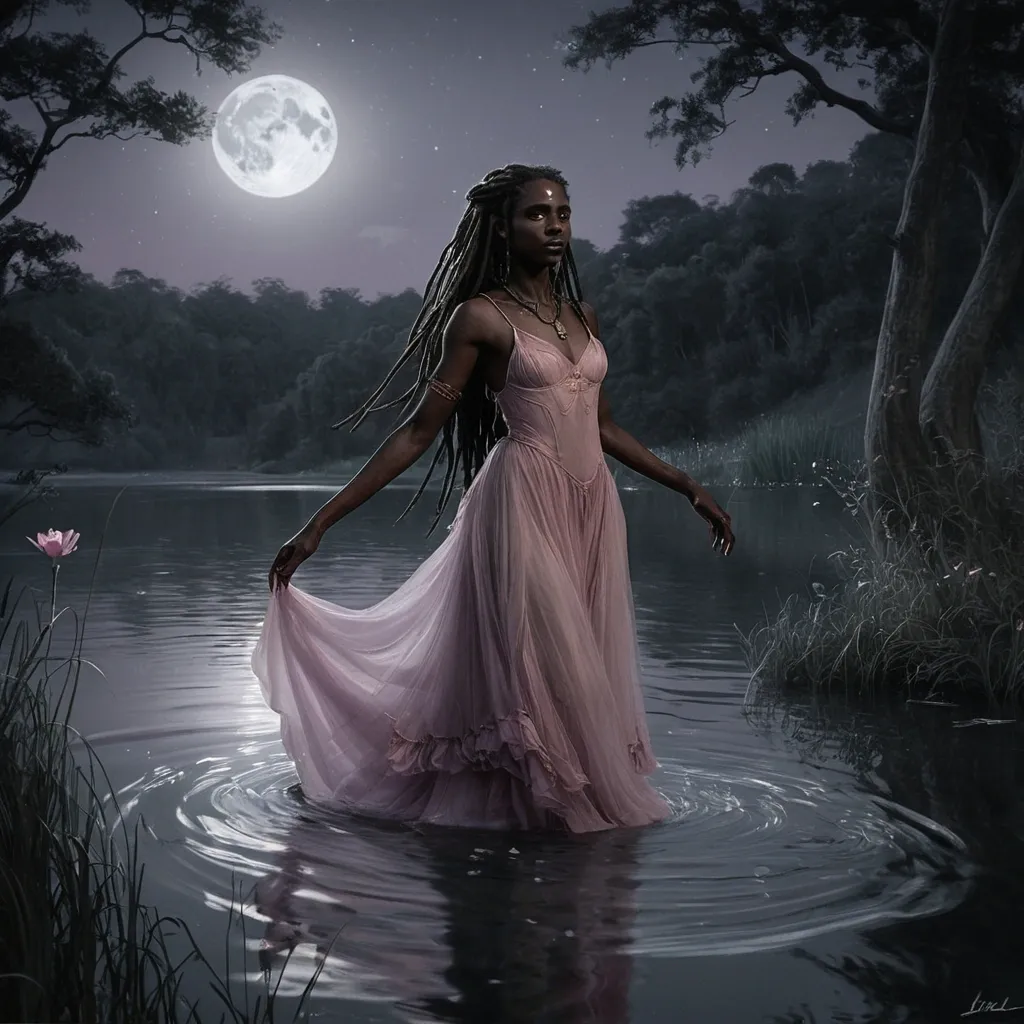 Artstation , Drawing , Graphite , Charcoal Art , "Illustration: A dreamlike scene bathed in soft , ethereal moonlight , representing a cherished memory at their secret , secluded lake. A woman , a mature and captivating presence with dark skin , long , flowing dark dreadlocks ('um rio de ébano a deslizar' - a river of ebony sliding down) , and striking eyes with reddish irises (similar to that of a vampire) , is dancing gracefully at the edge of the lake. She is wearing a delicate , flowing dress that resembles a blooming flower ('Seu vestido , a pétala de uma flor a desabrochar' - Her dress , the petal of a flower blooming). Her movements are fluid and expressive , conveying a sense of joy and freedom. Seated on the bank of the lake , a man of imposing presence with dark skin , dreadlocks , and striking eyes with a wolf-like coloration watches her with a loving and protective gaze. The lake is surrounded by lush vegetation and ancient trees , creating a sense of timeless beauty and seclusion. The overall mood is one of longing , nostalgia , and idealized beauty , representing their private sanctuary. The style is romantic and ethereal , reminiscent of a Pre-Raphaelite painting or a dream sequence in a classic film. The color palette is soft and pastel , with gentle hues of pink , purple , and gold dominating , reflecting the moonlight and the natural beauty of the scene." ,