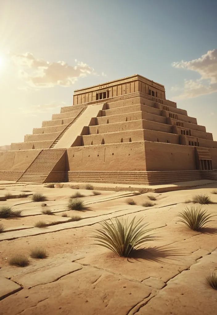 Ziggurat of Ur , grand stepped temple rising from desert plain near Ur , surrounded by low mud-brick dwellings and sparse palms , midday sun under clear dry skies , early summer , Style: hyperrealistic with a painterly texture , reminiscent of historical reconstruction art , detailed and atmospheric with subtle depth of field , Wide view , Side View , 4K. ,