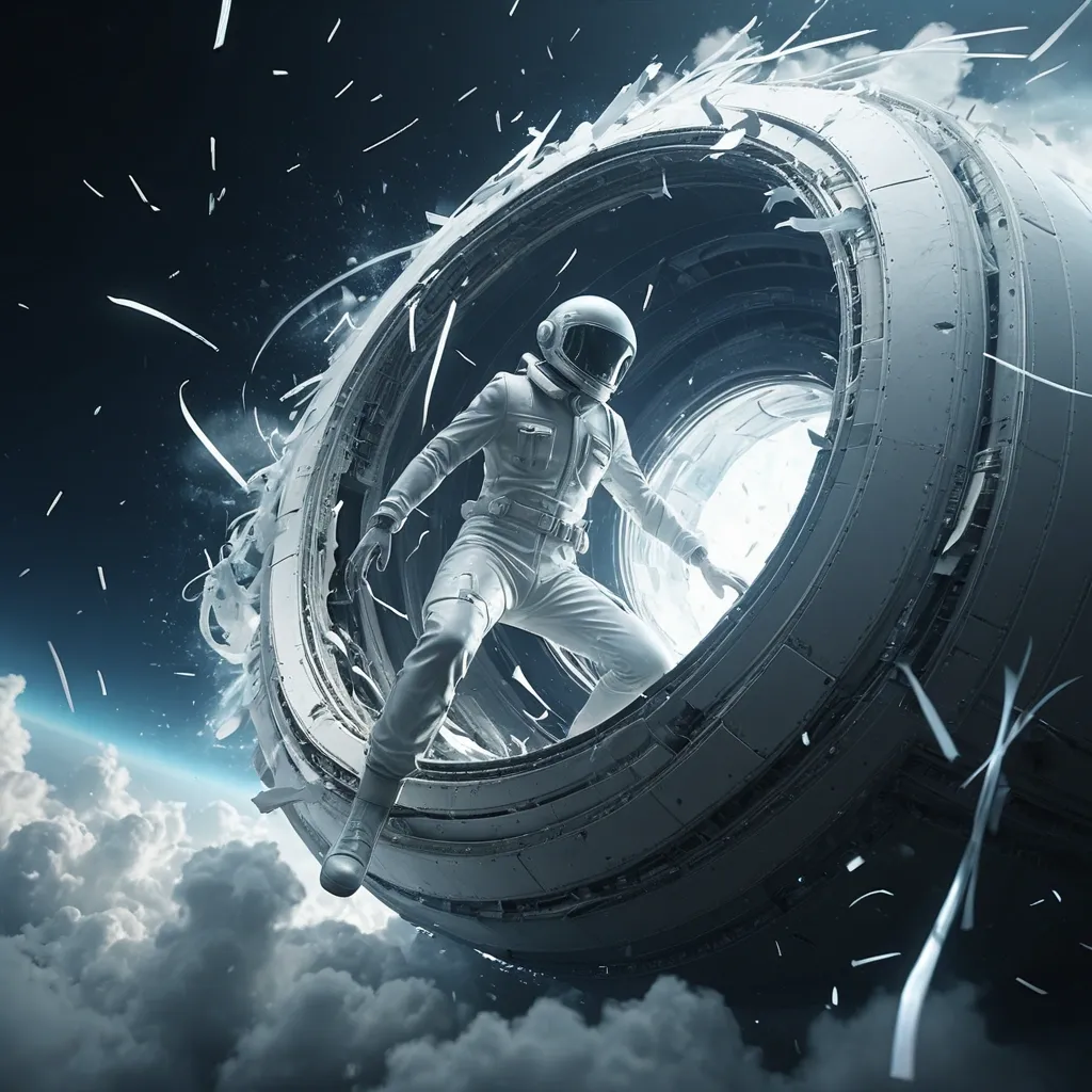 A highly stylized 3D render of a featureless human figure trapped inside a torn piece of airplane fuselage , spinning as it falls through vortex clouds , holding onto metal edges. The figure is wearing a damaged flight uniform. Style: Celestial , ethereal , abstract , digital art smoking: Dramatic backlighting , bright glowing particles , contrasting dark background Composition: dynamic diagonal composition , upward gaze Details: Sparkling white waves and clouds , streaking white light trails , sense of movement and wonder , magical atmosphere Quality: High detail , 4K , Masterpiece , Rendered in Octane ,