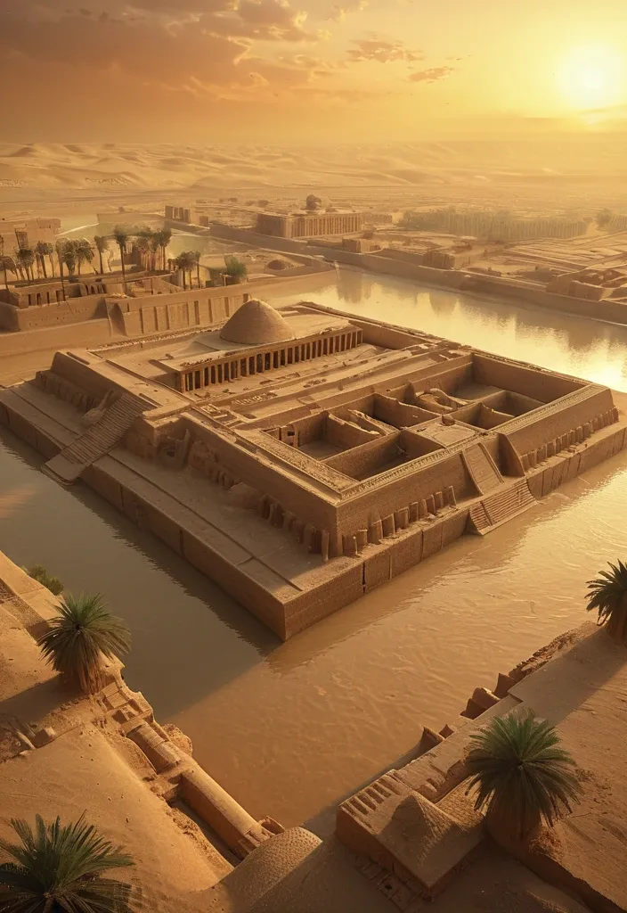 Nippur in 2000 BCE , sacred Sumerian city on the Euphrates plain , towering E-kur ziggurat amid canals and palms , sunset glow with dust haze after rain , late summer , Style: hyperrealistic with a painterly texture , reminiscent of historical reconstruction art , detailed and atmospheric with subtle depth of field , Wide view , Side View , 4K. ,