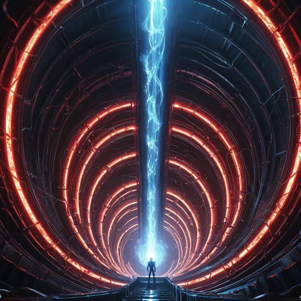 A massive , cylindrical , vertical sci-fi ventilation well stretching into the swirling vortex seen from above with walls covered in intricate pipes of various thicknesses and scattered red lights. Inside the shaft a hovering Iron-man with jets on. A mysterious blue electrical storm crackles at the bottom of the ventilation shaft casting an eerie glow. Style: Celestial , ethereal , abstract , digital art Lighting: Dramatic backlighting , bright glowing particles , contrasting dark background Composition: dynamic diagonal composition , upward gaze Details: Sparkling white waves and smoke , streaking white light trails , sense of movement and wonder , magical atmosphere Quality: High detail , 4K , Masterpiece , Rendered in Octane ,
