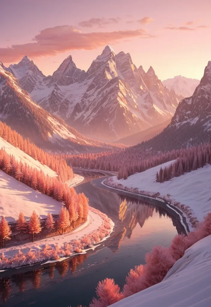 A breathtaking mountain vista at dawn , bathed in the soft , warm light of the rising sun. The peaks are dusted with snow , and a winding river snakes through the valley below , reflecting the sky's gradient of pinks and oranges. This scene is rendered in a hyperrealistic style , emphasizing natural beauty and serene atmosphere. ,