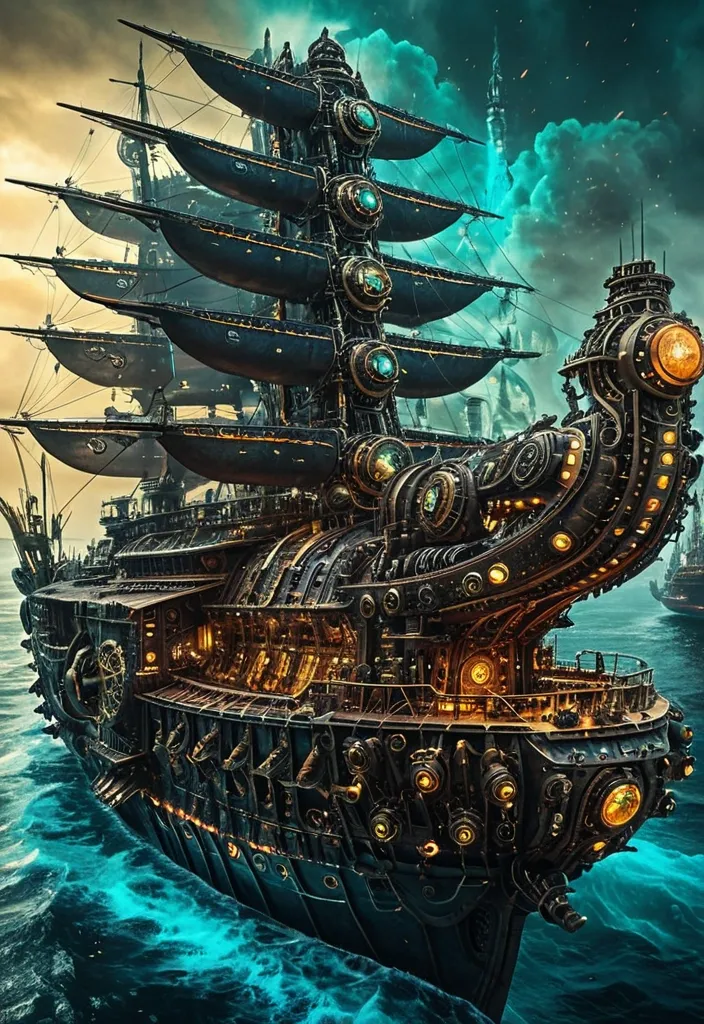 An advanced , Alien-controlled steampunk battleship with brass gears and sails across a vibrant inspired by indigenous cultural art , navigates through a ocean of swirling , iridescent gases. Small , agile drones swarm around it like protective fireflies. The style is hyperrealistic with maximalist detail , reminiscent of the intricate mechanical designs of H.R. Giger and the detailed historical paintings of J.M.W. Turner. ,