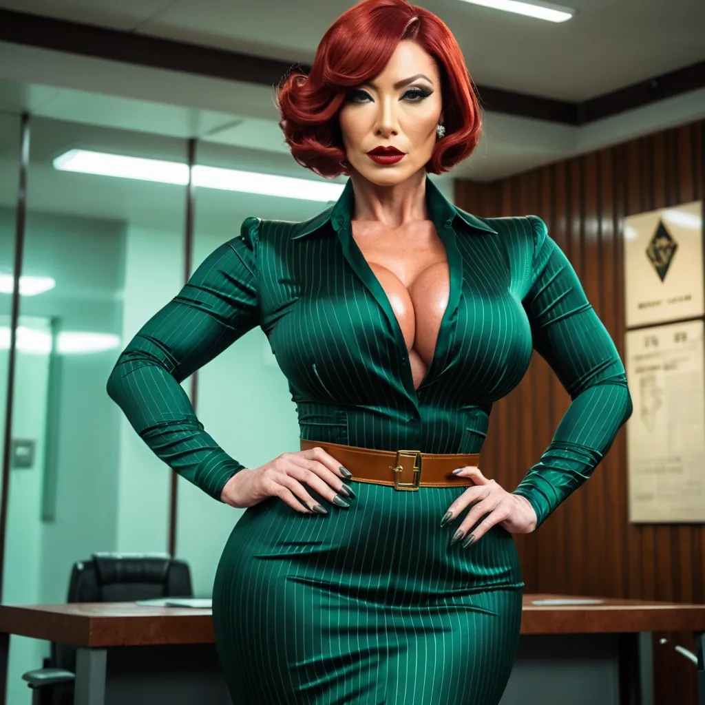 Generate Gorgeous female boss , bimbo , hourglass body , Japanese woman , abnormally massive female bodybuilder , gorgeous , close up , full lips , big booty , red hair short bob-cut hair style , feminine silhouette , too big breast , big booty , sexy thighs abs , silhouette , up close , flexing biceps , beautiful green eyes , legs are iconic and defining physical feature , both visually and in terms of combat ability.wearing an outfit that is a striking blend of elegance , power , and femininity , designed to command attention in any room. The suit is tailored to perfection , hugging the wearer’s curves with precision while emphasizing a structured silhouette. The fabric itself is a refined grey tweed patterned with subtle white grid lines , giving the suit a texture that feels both sophisticated and modern. The blazer features broad blue lapels and gold button accents , adding a luxurious touch that elevates the look beyond typical business attire. The matching high-waisted trousers elongate the frame , further enhancing the poised and commanding effect of the ensemble.The styling choices amplify the boldness of the suit. The inner blouse is a silky , greybutton-down shirt that complements the tweed’s tone while introducing a softer , feminine balance to the sharp tailoring of the jacket. The blouse peeks out neatly from under the blazer , maintaining elegance without drawing focus away from the suit’s commanding cut. Accessories are kept minimal yet intentional: a delicate layered gold necklace and hoop earrings that add glimmers of light and luxury without overpowering the outfit. The choice of voluminous , honey-brown braids cascading down her shoulders frames the face with both confidence and glamour , completing the commanding visual.Altogether , this look communicates a blend of authority and allure. It is business-ready yet fashion-forward , balancing corporate structure with vibrant femininity. The color palette blue , grey and gold avoids being overly delicate , instead embracing the richness of texture , structure , and presence. This is the kind of ensemble that speaks to ambition , sophistication , and personal style—ideal for someone who thrives in positions of influence but insists on expressing her individuality with bold elegance. It’s not just clothing—it’s a statement of power wrapped in grace. In luxury living legs that could crush a watermelon , skirt high boots are a bold and striking statement piece , crafted in glossy black patent leather that gives them a sleek , polished finish. Rising to just below the knee , the boots feature three adjustable buckle straps along the shaft , adding both edge and detail to their design. The towering stiletto heel , paired with a thick platform sole , creates an ultra-dramatic silhouette that elongates the leg and exudes power and confidence. With their combination of shine , height , and structure , these boots perfectly balance fierce femininity with high-fashion allure. Massive breast , massive cleavage , Up close shotShe’s wearing a fitted , futuristic 1940s-inspired tan utility suit with a structured vest , reinforced seams , integrated tech bracers , and elegant vertical lines forming a subtle ogee pattern that emphasizes strength , symmetry , and refined power.She’s wearing a fitted , futuristic 1940s-inspired leater , tan utility suit with a structured vest , reinforced seams , integrated tech bracers , and elegant vertical lines forming a subtle ogee pattern that emphasizes strength , symmetry , and refined power. Gorgeous brown eyes , enormous butt , enormous breast , thunder thighs and hips , powerful hourglass feminine silhouette stackedShe’s dressed in a deep emerald satin blouse with a subtle art-deco chevron pattern , tailored snugly at the waist , paired with a brown long skirt threaded with faint emerald green pinstripes , she is standing in a art-deco police station , enormous breast , enormous butt , powerful hips ,