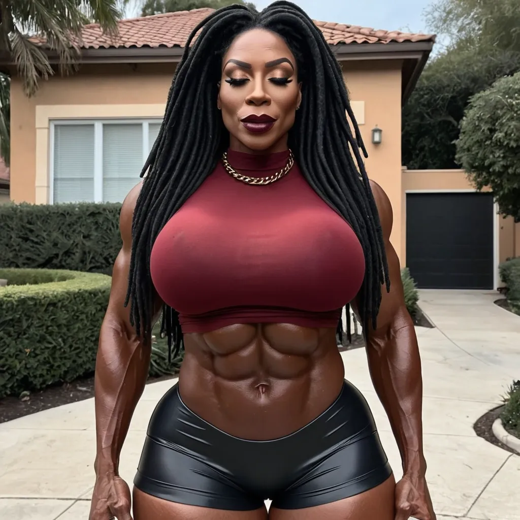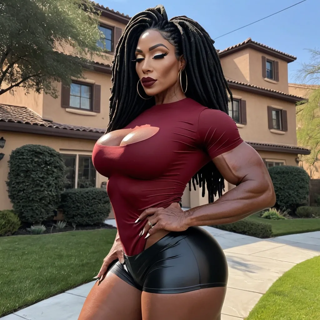 43 years old Generate Gorgeous female boss , dreadlocks bimbo , dark African-American woman , modest collar hourglass body , female bodybuilder , gorgeous , close up , full lips , big booty , black hair , natural futuristic dreadlocks design hair , feminine silhouette , too big breast , big booty , sexy thighs abs , silhouette , up close , flexing biceps , beautiful dark brown eyes , legs are iconic and defining physical feature , both visually and in terms of combat ability.wearing an outfit that is a striking blend of elegance , power , and femininity , designed to command attention in any room. The suit is tailored to perfection , hugging the wearer’s curves with precision while emphasizing a structured silhouette. The fabric itself is a refined grey tweed patterned with subtle white grid lines , giving the suit a texture that feels both sophisticated and modern. The blazer features broad blue lapels and gold button accents , adding a luxurious touch that elevates the look beyond typical business attire. The matching high-waisted trousers elongate the frame , further enhancing the poised and commanding effect of the ensemble.The styling choices amplify the boldness of the suit. The inner blouse is a silky , greybutton-down shirt that complements the tweed’s tone while introducing a softer , feminine balance to the sharp tailoring of the jacket. The blouse peeks out neatly from under the blazer , maintaining elegance without drawing focus away from the suit’s commanding cut. Accessories are kept minimal yet intentional: a delicate layered gold necklace and hoop earrings that add glimmers of light and luxury without overpowering the outfit. The choice of voluminous , honey-brown braids cascading down her shoulders frames the face with both confidence and glamour , completing the commanding visual.Altogether , this look communicates a blend of authority and allure. It is business-ready yet fashion-forward , balancing corporate structure with vibrant femininity. The color palette blue , grey and gold avoids being overly delicate , instead embracing the richness of texture , structure , and presence. This is the kind of ensemble that speaks to ambition , sophistication , and personal style—ideal for someone who thrives in positions of influence but insists on expressing her individuality with bold elegance. It’s not just clothing—it’s a statement of power wrapped in grace. In luxury living legs that could crush a watermelon , , feminine silhouette , too big breast , big booty , sexy thighs abs , silhouette , up close , flexing biceps , beautiful brown eyes , closed top. , waking in a beautiful rich neighborhood , facing viewer , up close , facing viewer She is extremely confident Her expression is playful and teasing , accentuated by glossy red lips and a slight blush. She has a enormous butt and enormous breast , she has big beautiful brown eyes. Burgundy t-shirt , black shorts ,
