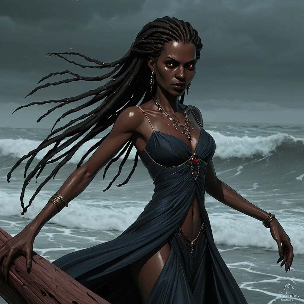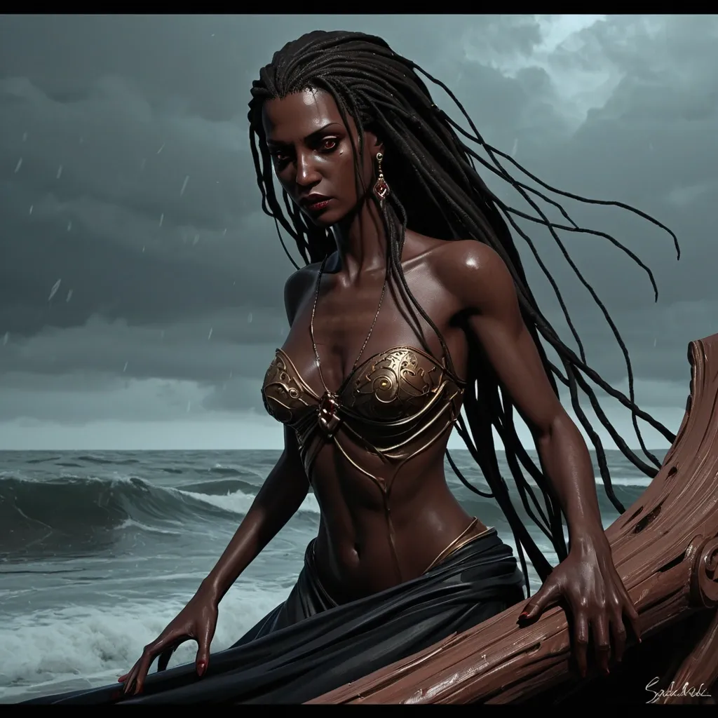 Artstation , Illustration , Graphic Novel , "Esbelta , elegante e graciosa (Slender , elegant , and graceful) , she possesses a timeless beauty that belies her true age. She appears to be in her late 20s to early 30s , with dark skin , long dark dreadlocks , and striking eyes that hold a captivating allure. Her eyes have a subtle reddish hue , a telltale sign of her vampiric nature , adding to her mystique. She carries herself with a quiet confidence and an air of sophistication , reflecting her long life and vast experiences. Her movements are fluid and graceful , like a dancer , and her presence commands attention without demanding it." , A panel showing a stylized shipwreck on a stormy sea. She is clinging to a piece of driftwood , her face etched with pain and despair , as she struggles to survive the storm. ,