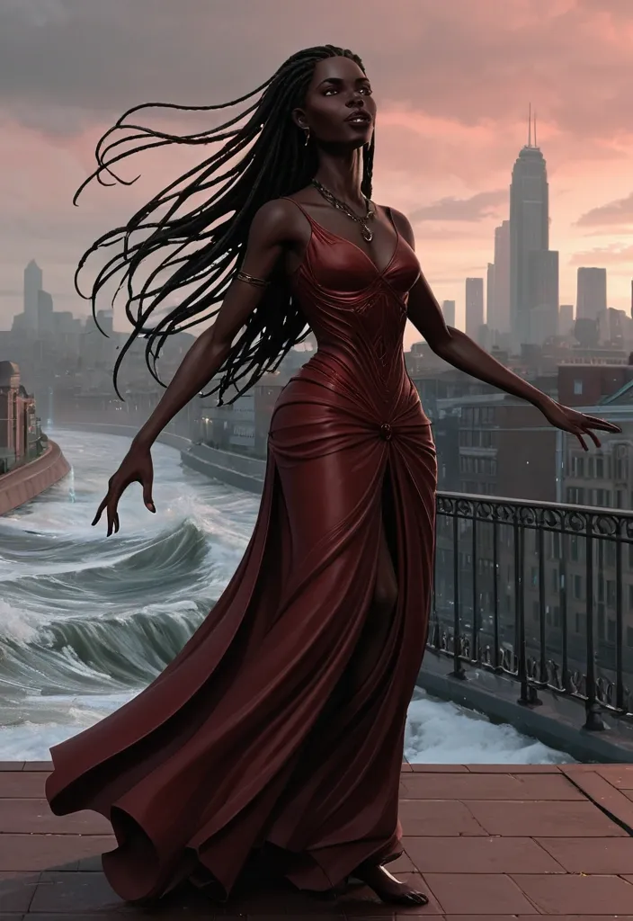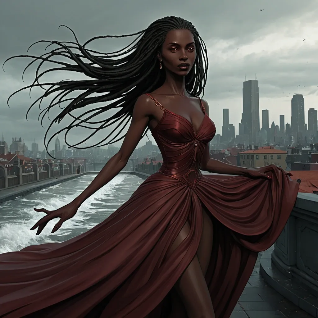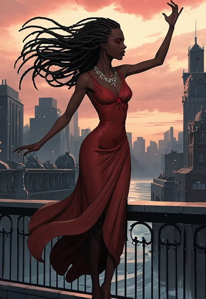 Artstation , Illustration , Graphic Novel , "Esbelta , elegante e graciosa (Slender , elegant , and graceful) , she possesses a timeless beauty that belies her true age. She appears to be in her late 20s to early 30s , with dark skin , long dark dreadlocks , and striking eyes that hold a captivating allure. Her eyes have a subtle reddish hue , a telltale sign of her vampiric nature , adding to her mystique. She carries herself with a quiet confidence and an air of sophistication , reflecting her long life and vast experiences. Her movements are fluid and graceful , like a dancer , and her presence commands attention without demanding it." , A panel showing a stylized tidal wave crashing over a city skyline. She is standing on a rooftop , her arms outstretched , as the wave of memories washes over her , her expression a mixture of joy and sorrow. ,