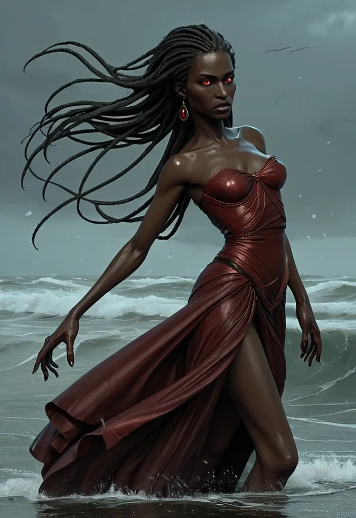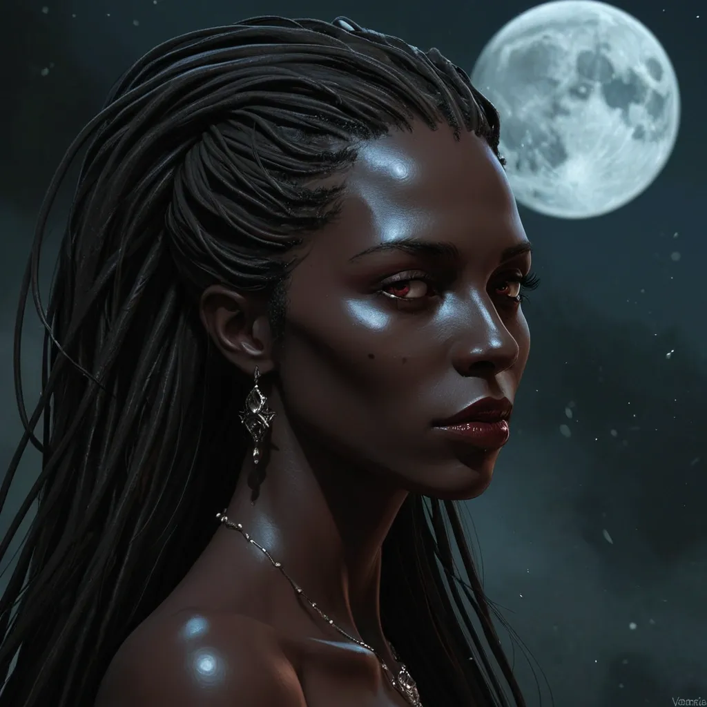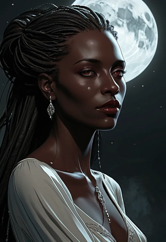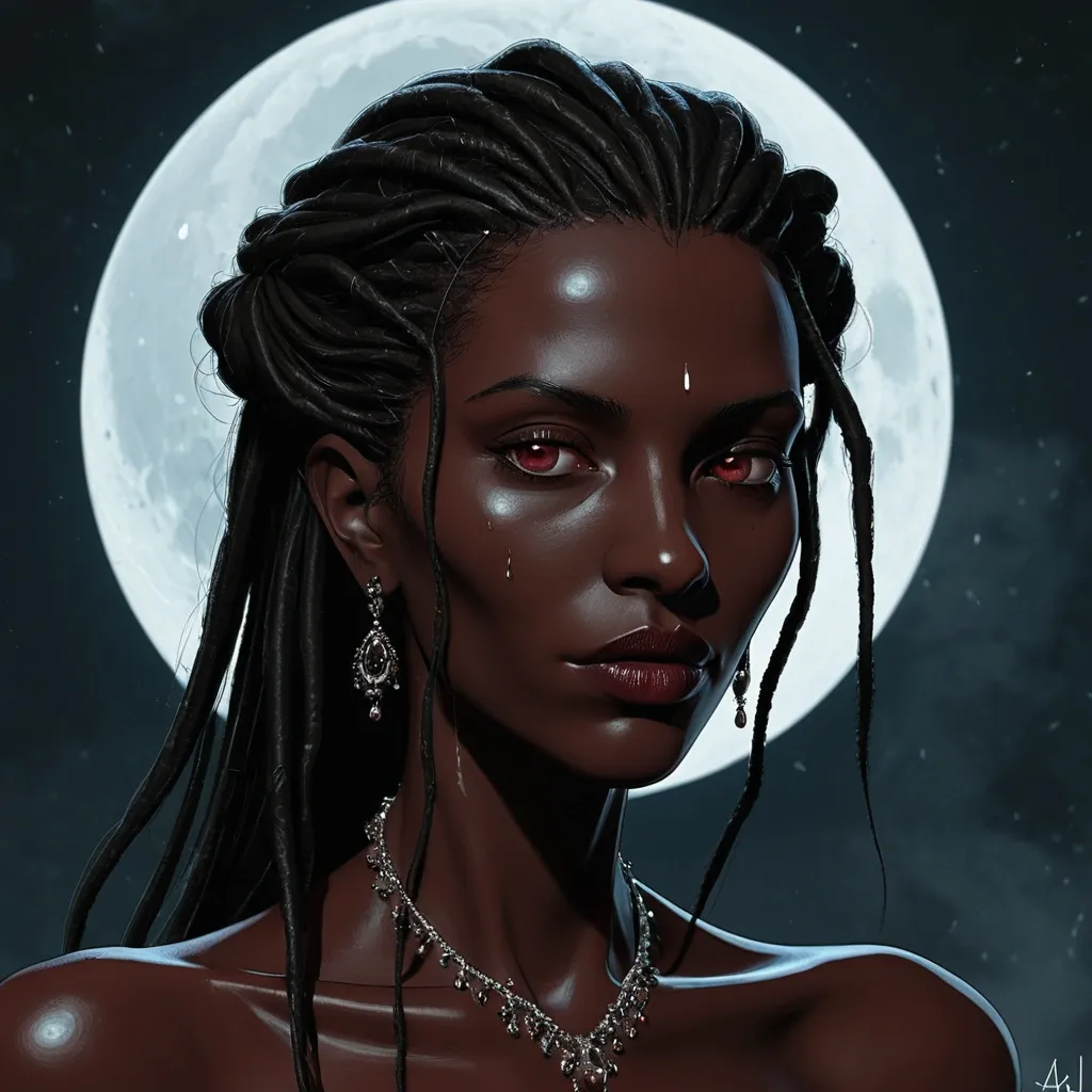 https://arthub.ai/post/22000d7f-3773-4fe9-a2a4-b98acd77fbcf Artstation , Illustration , Graphic Novel , "Generate an image representing longing for the chorus scene. The scene depicts her , a slender and graceful vampire in her late 20s to early 30s with dark skin , long dark dreadlocks , and naturally reddish eyes (without an intense glow) , looking out a window. Tears stream down her face as she gazes at the full moon from inside her room. She is wearing short , light clothing. It is a full moon night." , "Esbelta , elegante e graciosa (Slender , elegant , and graceful) , she possesses a timeless beauty that belies her true age. She appears to be in her late 20s to early 30s , with dark skin , long dark dreadlocks , and striking eyes that hold a captivating allure. Her eyes have a subtle reddish hue , a telltale sign of her vampiric nature , adding to her mystique. She carries herself with a quiet confidence and an air of sophistication , reflecting her long life and vast experiences. Her movements are fluid and graceful , like a dancer , and her presence commands attention without demanding it." ,
