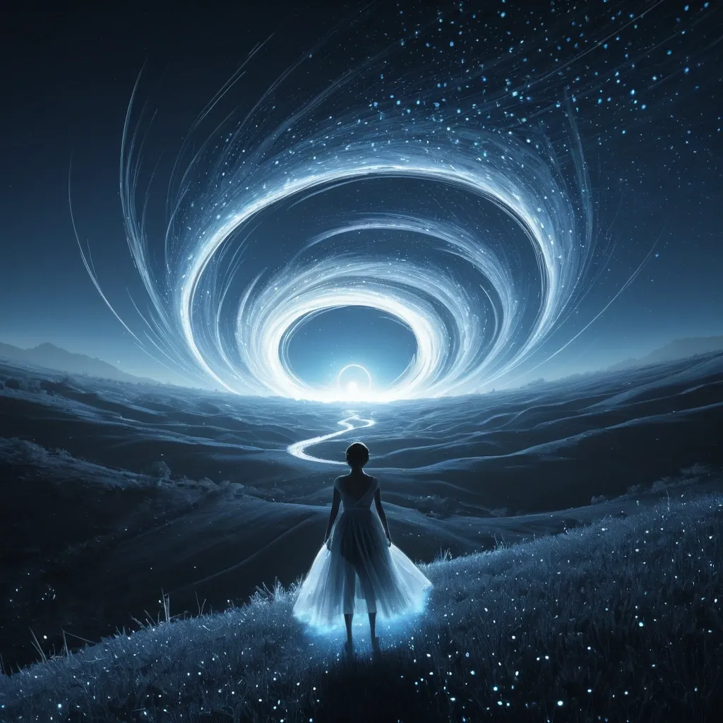 A high-angle bird's-eye view , a landscape Tornado Melting from a vortex moonlight rendered as a Fractal ray , abstract graphic Interference style , A lone woman stands on , gazing at a moonlight that paints the sky in hues of blue , gray and black , shrouded in light-blue and white tulle-like dots , set against a low-resolution dark night background with subtle white accents. The minimalist , naturalistic landscape features a dynamic diagonal composition with dramatic backlighting , bright glowing particles , and streaking white light trails , evoking a sense of movement , wonder , and magical atmosphere , rendered in high-detail 4K with Octane. ,