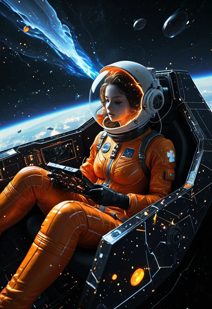 A greatest masterpiece , Dark space , Light and stars are being sucked into a outer space with spacecraft uniquely Orange game remote shaped , a female pilot sitting in the glass cockpit , flying over. Distortion of outer space. Style: Celestial , ethereal , abstract , digital art Lighting: Dramatic backlighting , bright glowing particles , contrasting dark background Composition: dynamic diagonal , composition , upward gaze Details: Sparkling white waves and smoke. ,