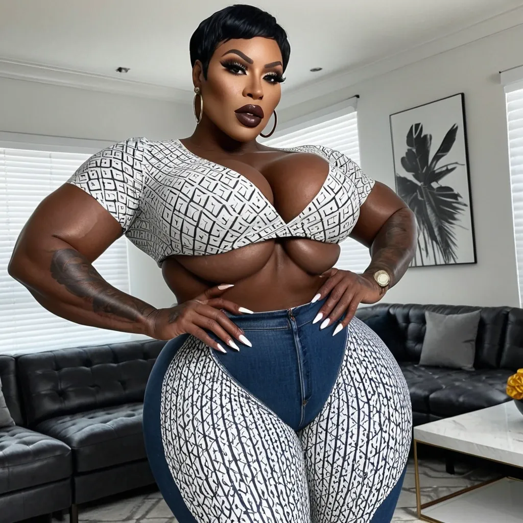 Generate Gorgeous female boss , bimbo , very dark-skinned African-American woman , short , pixie hair , hourglass body , abnormally massive female bodybuilder , gorgeous , close up , full lips , big booty , dark brown eyes , very big plump lips , feminine silhouette , too big breast , big booty , sexy thighs abs , silhouette , up close , flexing biceps , big gorgeous light brown eyes , legs are iconic and defining physical feature , both visually and in terms of combat ability.wearing an outfit that is a striking blend of elegance , power , and femininity , designed to command attention in any room. The suit is tailored to perfection , hugging the wearer’s curves with precision while emphasizing a structured silhouette. The fabric itself is a refined grey tweed patterned with subtle white grid lines , giving the suit a texture that feels both sophisticated and modern. The blazer features broad blue lapels and gold button accents , adding a luxurious touch that elevates the look beyond typical business attire. The matching high-waisted trousers elongate the frame , further enhancing the poised and commanding effect of the ensemble.The styling choices amplify the boldness of the suit. The inner blouse is a silky , greybutton-down shirt that complements the tweed’s tone while introducing a softer , feminine balance to the sharp tailoring of the jacket. The blouse peeks out neatly from under the blazer , maintaining elegance without drawing focus away from the suit’s commanding cut. Accessories are kept minimal yet intentional: a delicate layered gold necklace and hoop earrings that add glimmers of light and luxury without overpowering the outfit. The choice of voluminous , honey-brown braids cascading down her shoulders frames the face with both confidence and glamour , completing the commanding visual.Altogether , this look communicates a blend of authority and allure. It is business-ready yet fashion-forward , balancing corporate structure with vibrant femininity. The color palette blue , grey and gold avoids being overly delicate , instead embracing the richness of texture , structure , and presence. This is the kind of ensemble that speaks to ambition , sophistication , and personal style—ideal for someone who thrives in positions of influence but insists on expressing her individuality with bold elegance. It’s not just clothing—it’s a statement of power wrapped in grace. In luxury living legs that could crush a watermelon , skirt high boots are a bold and striking statement piece , crafted in glossy black patent leather that gives them a sleek , polished finish. Rising to just below the knee , the boots feature three adjustable buckle straps along the shaft , adding both edge and detail to their design. The towering stiletto heel , paired with a thick platform sole , creates an ultra-dramatic silhouette that elongates the leg and exudes power and confidence. With their combination of shine , height , and structure , these boots perfectly balance fierce femininity with high-fashion allure. Massive breast , massive cleavage , driving and standing in living room , wearing a white , dark navy blue and black accented subtle symmetrical patterned t-shirt , black denim pants , enormous butt She puts her hands out doing a pinching jester ,