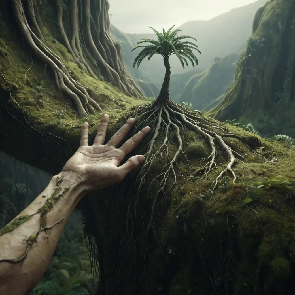 surreal environmental scene where a human arm rises naturally upward from the ground , arm extended vertically and wrist gently bent so the palm faces horizontally like a landscape plateau , the palm fully transformed into natural terrain , skin seamlessly becoming soil , moss , roots and vegetation , a tree growing from the center as if planted in fertile earth , fingers reshaped into hills and landforms rather than recognizable fingers , total organic fusion between hand and ecosystem , the hand elevated but clearly attached to a real arm and body below frame , not floating , photorealistic textures , cinematic lighting , soft natural atmosphere , environmental concept art , magical realism , ultra detailed , wide shot , depth , 8k ,