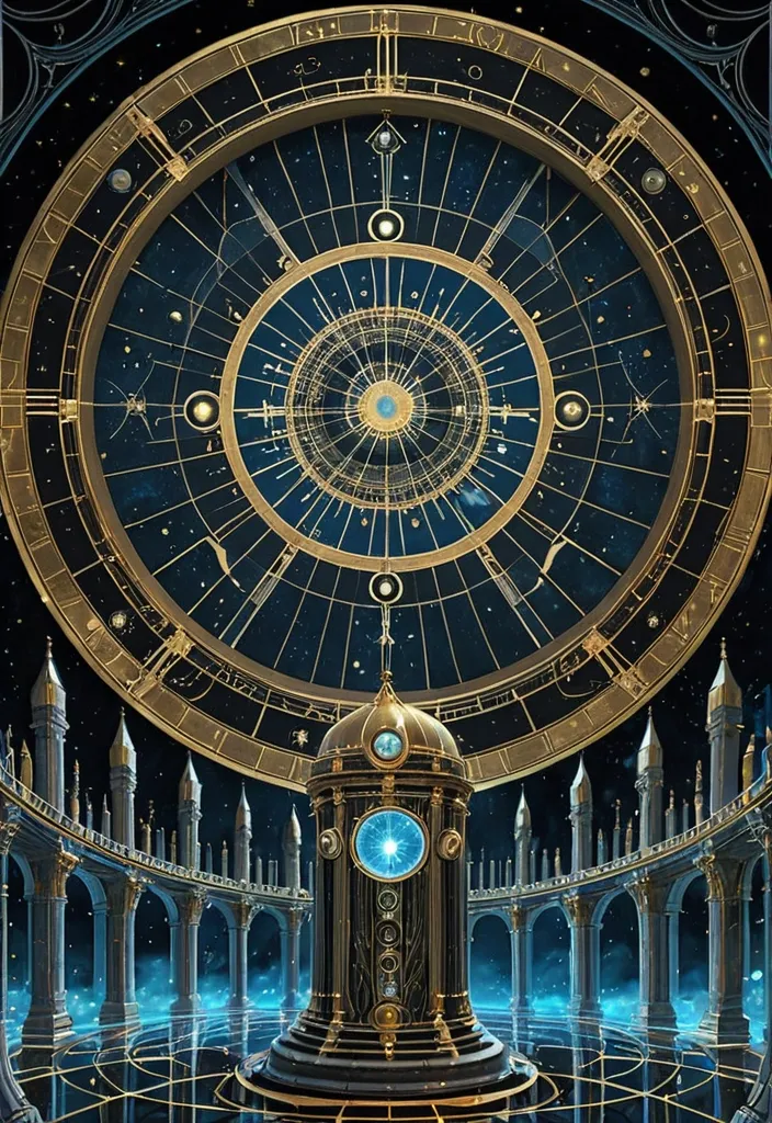 Crowning chamber beneath the great crystal lens of the Eye of Hours. Floor of polished obsidian inlaid with gold lines forming a vast clock face. The rotating crystal lens above refracts moonlight and city glow into shimmering beams. Brass telescopes , star charts , and rotating rings track celestial movement. A magical control dais projects faint holographic maps of the world’s ley lines. Wind from open vents moves robes and scrolls; a feeling of sacred science. Lighting: cool moonlight and crystal reflections , slight mist. Camera: low angle looking upward toward the lens. Style: hyper-detailed digital painting , golden and blue palette , awe-inspiring tone. ,