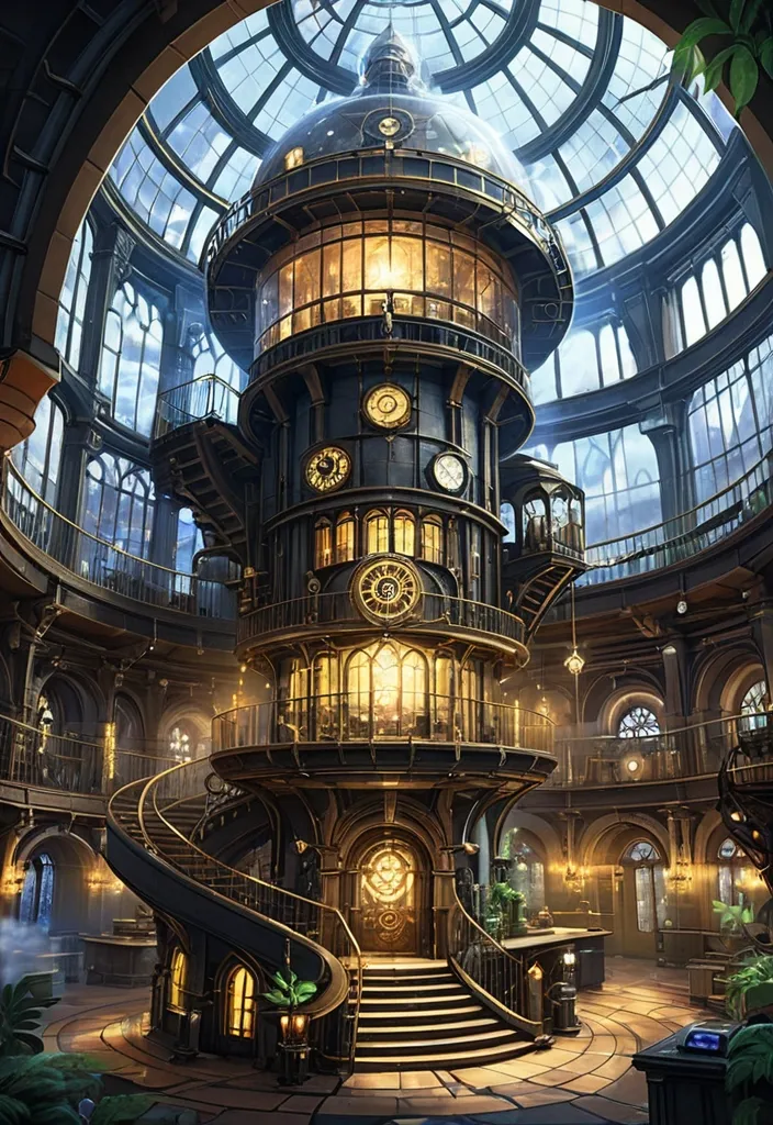 A detailed fantasy cutaway illustration of a six-level clocktower headquarters , blending arcane architecture and steampunk design. Each level distinct: reception hall (desks , ledgers , gears) , living workshop (bunks , tools , warmth) , training arena (obsidian rings , magical sparks) , greenhouse (glass dome , glowing plants , mist) , research lab (Resonator Table , runes , floating quills) , observatory (rotating crystal lens , starlight). Include spiral stair and central lift through all floors. Brass , iron , and crystal dominate the color palette; golden light below , cool silver above. Style: semi-realistic digital painting , cinematic , highly detailed , slightly cutaway side view. ,
