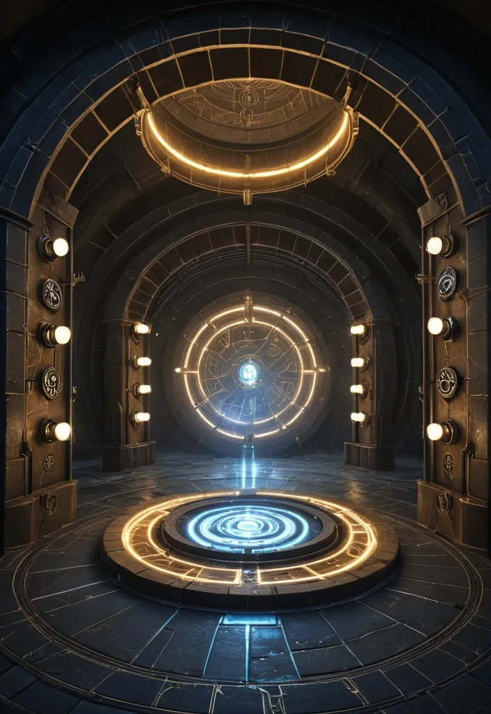 A fortified circular hall deep within the clocktower’s core , designed for testing and tempering magical artifacts. The walls are lined with engraved runic plates and pivoting bronze mirrors , each capable of redirecting spell energy. A reinforced obsidian floor etched with concentric containment rings marks the testing area’s center. Suspended sigil projectors hover above like chandeliers , forming shifting shields of light when activated. Training dummies made of wood , steel , and enchanted clay stand ready , some half-shattered from previous trials. Along the far wall , a rack of prototype weapons and spell-foci glimmers under torchlight — Orwen’s unfinished experiments. When spells are cast here , energy disperses through glowing conduits in the ceiling , absorbed by humming arcane capacitors. Lighting: high-contrast gold and blue , faint sparks in the air. Camera: wide shot from the balcony overlooking the testing circle. Style: semi-realistic fantasy artwork , metallic gleam , dynamic tension , warm-meets-cool light palette. ,