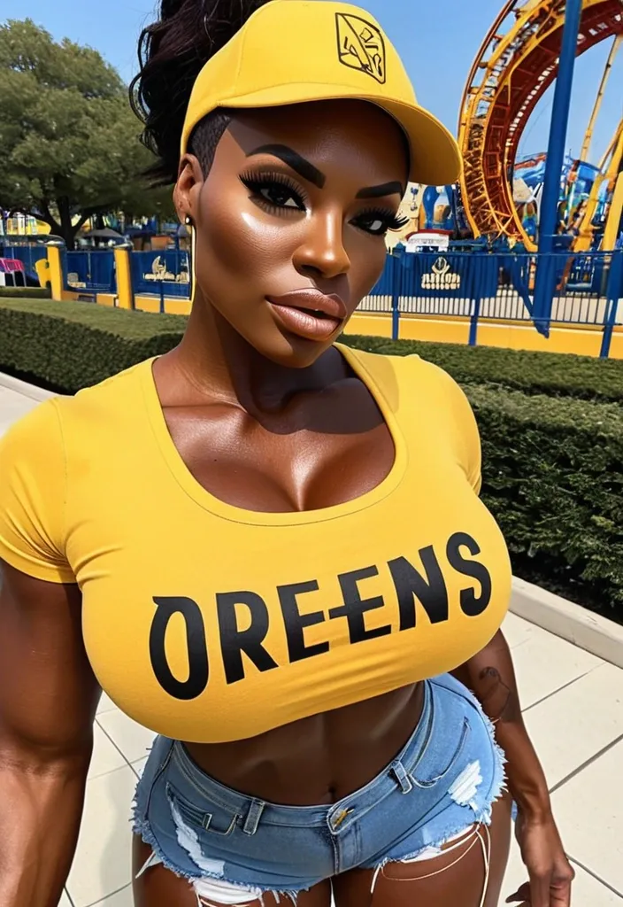 Generate Gorgeous female boss , bimbo , dark-skinned very African-American female , hourglass body , abnormally massive female bodybuilder , gorgeous , close up , full lips , big booty , brown , on face and breast , short pixie hair , shaved on the side , feminine silhouette , too big breast , big booty , sexy thighs abs , silhouette , up close , flexing biceps , beautiful green eyes , legs are iconic and defining physical feature , both visually and in terms of combat ability.wearing an outfit that is a striking blend of elegance , power , and femininity , designed to command attention in any room. The suit is tailored to perfection , hugging the wearer’s curves with precision while emphasizing a structured silhouette. The fabric itself is a refined grey tweed patterned with subtle white grid lines , giving the suit a texture that feels both sophisticated and modern. The blazer features broad blue lapels and gold button accents , adding a luxurious touch that elevates the look beyond typical business attire. The matching high-waisted trousers elongate the frame , further enhancing the poised and commanding effect of the ensemble.The styling choices amplify the boldness of the suit. The inner blouse is a silky , greybutton-down shirt that complements the tweed’s tone while introducing a softer , feminine balance to the sharp tailoring of the jacket. The blouse peeks out neatly from under the blazer , maintaining elegance without drawing focus away from the suit’s commanding cut. Accessories are kept minimal yet intentional: a delicate layered gold necklace and hoop earrings that add glimmers of light and luxury without overpowering the outfit. The choice of voluminous , honey-brown braids cascading down her shoulders frames the face with both confidence and glamour , completing the commanding visual.Altogether , this look communicates a blend of authority and allure. It is business-ready yet fashion-forward , balancing corporate structure with vibrant femininity. The color palette blue , grey and gold avoids being overly delicate , instead embracing the richness of texture , structure , and presence. This is the kind of ensemble that speaks to ambition , sophistication , and personal style—ideal for someone who thrives in positions of influence but insists on expressing her individuality with bold elegance. It’s not just clothing—it’s a statement of power wrapped in grace. In luxury living legs that could crush a watermelon , skirt high boots are a bold and striking statement piece , crafted in glossy black patent leather that gives them a sleek , polished finish. Rising to just below the knee , the boots feature three adjustable buckle straps along the shaft , adding both edge and detail to their design. The towering stiletto heel , paired with a thick platform sole , creates an ultra-dramatic silhouette that elongates the leg and exudes power and confidence. With their combination of shine , height , and structure , these boots perfectly balance fierce femininity with high-fashion allure. High cheekbones , prominent jawline , gorgeous big light reflecting hazel eyes , enormous breast , cartoon bunny on yellow t-shirt-shirt , denim shorts , denim baseball cap walking in amusement park , ,