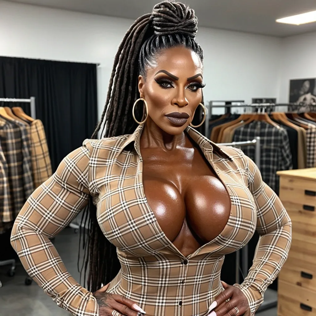 Generate Gorgeous female boss , bimbo , 42 years old , very dark-skinned African-American woman , , gorgeous hazel eyes , hourglass body , abnormally massive female bodybuilder , gorgeous , close up , full lips , big booty , dreadlocks , updo , feminine silhouette , too big breast , big booty , sexy thighs abs , silhouette , up close , flexing biceps , beautiful hazel eyes , legs are iconic and defining physical feature , both visually and in terms of combat ability.wearing an outfit that is a striking blend of elegance , power , and femininity , designed to command attention in any room. The suit is tailored to perfection , hugging the wearer’s curves with precision while emphasizing a structured silhouette. The fabric itself is a refined grey tweed patterned with subtle white grid lines , giving the suit a texture that feels both sophisticated and modern. The blazer features broad blue lapels and gold button accents , adding a luxurious touch that elevates the look beyond typical business attire. The matching high-waisted trousers elongate the frame , further enhancing the poised and commanding effect of the ensemble.The styling choices amplify the boldness of the suit. The inner blouse is a silky , greybutton-down shirt that complements the tweed’s tone while introducing a softer , feminine balance to the sharp tailoring of the jacket. The blouse peeks out neatly from under the blazer , maintaining elegance without drawing focus away from the suit’s commanding cut. Accessories are kept minimal yet intentional: a delicate layered gold necklace and hoop earrings that add glimmers of light and luxury without overpowering the outfit. The choice of voluminous , honey-brown braids cascading down her shoulders frames the face with both confidence and glamour , completing the commanding visual.Altogether , this look communicates a blend of authority and allure. It is business-ready yet fashion-forward , balancing corporate structure with vibrant femininity. The color palette blue , grey and gold avoids being overly delicate , instead embracing the richness of texture , structure , and presence. This is the kind of ensemble that speaks to ambition , sophistication , and personal style—ideal for someone who thrives in positions of influence but insists on expressing her individuality with bold elegance. It’s not just clothing—it’s a statement of power wrapped in grace. In luxury living legs that could crush a watermelon , skirt high boots are a bold and striking statement piece , crafted in glossy black patent leather that gives them a sleek , polished finish. Rising to just below the knee , the boots feature three adjustable buckle straps along the shaft , adding both edge and detail to their design. The towering stiletto heel , paired with a thick platform sole , creates an ultra-dramatic silhouette that elongates the leg and exudes power and confidence. With their combination of shine , height , and structure , these boots perfectly balance fierce femininity with high-fashion allure. High cheekbones , prominent jawline , gorgeous big hazel eyes , brown , enormous breast , plaid designed dress shirt , beige cargo panta ,