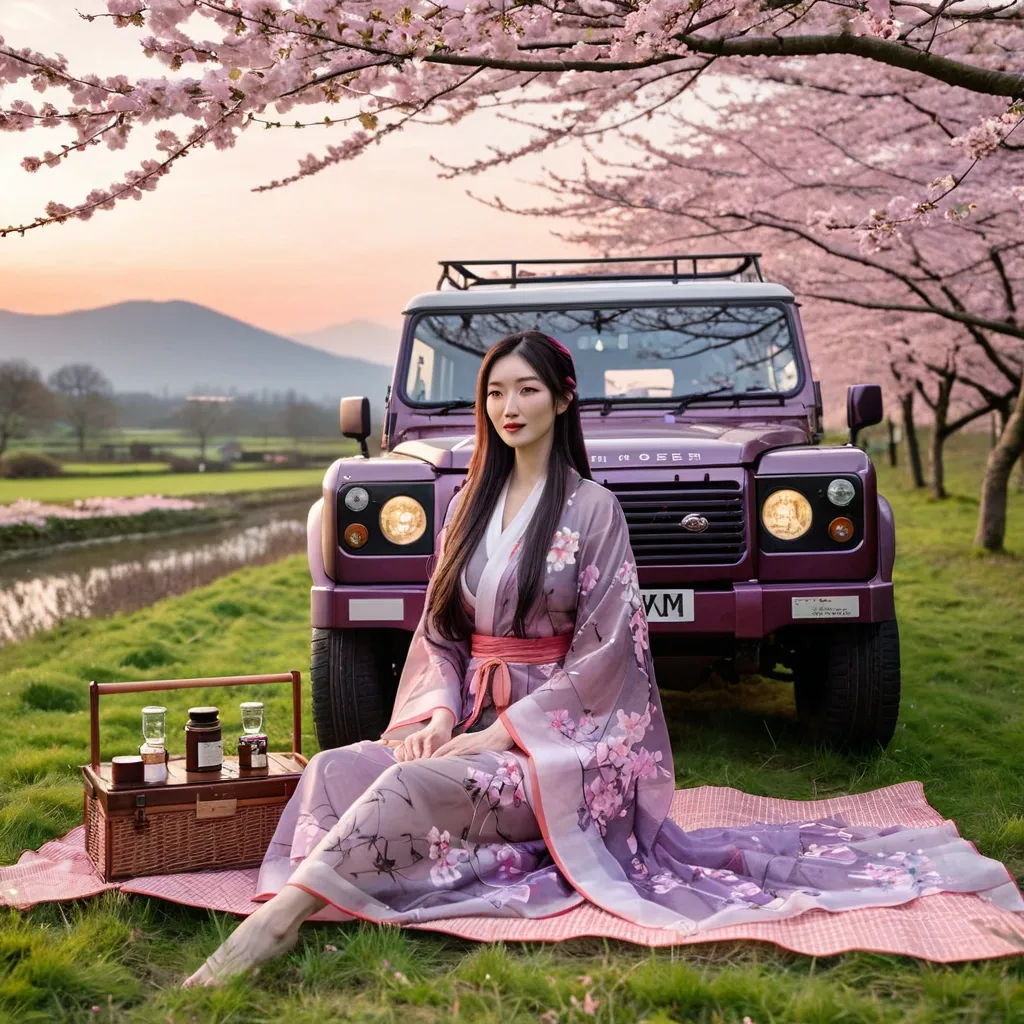 A young woman seated on a traditional Japanese wooden bench. The woman , with long , flowing dark brown hair with pink streaks adorned with a pink flower , is dressed in a delicate , semi-transparent purple kimono with large floral patterns , revealing her fair skin and slender , elegant physique , there is a green Land Rover Defender parked on a Cherry blossom Spring field with a tent on top , surrounded by camping gear such as jars , a map , and a picnic basket. the sky is a beautiful sunset with orange and pink hues , creating a warm and inviting atmosphere. ,