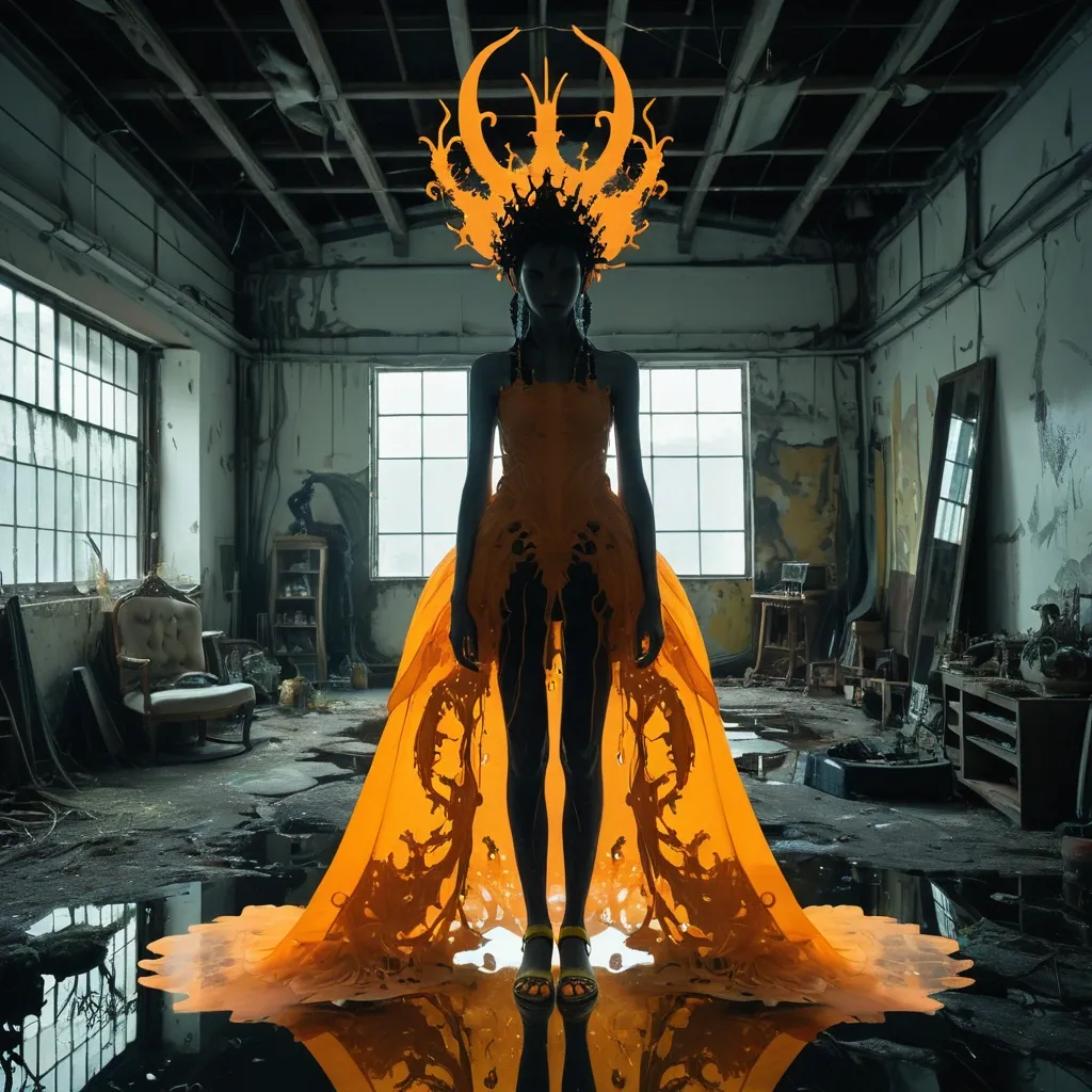 A double exposure merges her silhouette with an inverted landscape. a majestic Xenomorph Queen , standing pose inside a derelict fashion studio , lost in thought. Wearing a ornate Dewdrop crown resembling a Witch crown-like structure composed of hanging eyes , seashell long orange gown. Her legs are crossed , and she wears yellow geta (traditional Japanese wooden sandals) , amidst a studio setup scenery of multiple exposures. ,