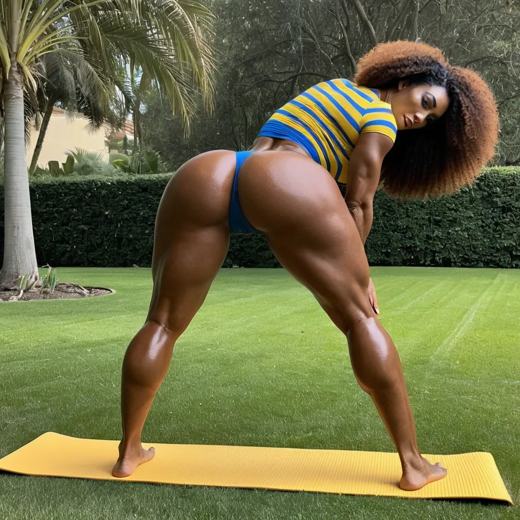 Generate Gorgeous 37 years old , female boss , dark-skinned African-American woman , bimbo , hourglass body , abnormally massive female bodybuilder , gorgeous , close up , full lips , big booty , brown , afro , feminine silhouette , too big breast , big booty , sexy thighs abs , silhouette , up close , flexing biceps , beautiful brown eyes , legs are iconic and defining physical feature , both visually and in terms of combat ability.wearing an outfit that is a striking blend of elegance , power , and femininity , designed to command attention in any room. The suit is tailored to perfection , hugging the wearer’s curves with precision while emphasizing a structured silhouette. The fabric itself is a refined grey tweed patterned with subtle white grid lines , giving the suit a texture that feels both sophisticated and modern. The blazer features broad blue lapels and gold button accents , adding a luxurious touch that elevates the look beyond typical business attire. The matching high-waisted trousers elongate the frame , further enhancing the poised and commanding effect of the ensemble.The styling choices amplify the boldness of the suit. The inner blouse is a silky , greybutton-down shirt that complements the tweed’s tone while introducing a softer , feminine balance to the sharp tailoring of the jacket. The blouse peeks out neatly from under the blazer , maintaining elegance without drawing focus away from the suit’s commanding cut. Accessories are kept minimal yet intentional: a delicate layered gold necklace and hoop earrings that add glimmers of light and luxury without overpowering the outfit. The choice of voluminous , honey-brown braids cascading down her shoulders frames the face with both confidence and glamour , completing the commanding visual.Altogether , this look communicates a blend of authority and allure. It is business-ready yet fashion-forward , balancing corporate structure with vibrant femininity. The color palette blue , grey and gold avoids being overly delicate , instead embracing the richness of texture , structure , and presence. This is the kind of ensemble that speaks to ambition , sophistication , and personal style—ideal for someone who thrives in positions of influence but insists on expressing her individuality with bold elegance. It’s not just clothing—it’s a statement of power wrapped in grace. In luxury living legs that could crush a watermelon , skirt high boots are a bold and striking statement piece , crafted in glossy black patent leather that gives them a sleek , polished finish. Rising to just below the knee , the boots feature three adjustable buckle straps along the shaft , adding both edge and detail to their design. The towering stiletto heel , paired with a thick platform sole , creates an ultra-dramatic silhouette that elongates the leg and exudes power and confidence. With their combination of shine , height , and structure , these boots perfectly balance fierce femininity with high-fashion allure. High cheekbones , prominent jawline , gorgeous big brown eyes , freckles , enormous breast , gray pants , yellow and blue horizontal striped v neck t- shirt , skirt , front yard gorgeous brown eyes , She is positioned on all fours , with her knees on the yoga mat and her hands placed in front of her for support. Her back is slightly arched and her upper body leans forward , creating a smooth curve through her torso and emphasizing her hips. This pose highlights her lower body and projects a confident , sensual stance while maintaining balance and control. Arched back stacked enormous round butt on all fours , arched back ,