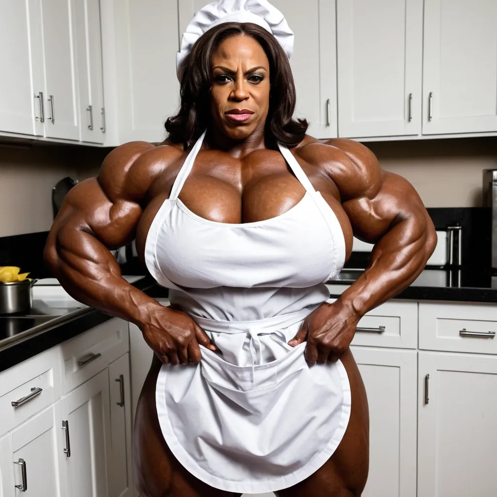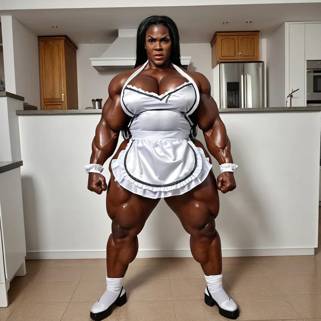 African Maid woman BBW musclée , heavy weight bodybuildeuse géante et massive , imposante dame noire , Kamala Harris face , avec de gros seins , énormes biceps musclés , in white mini apron tablier sexy , exposant les seins , bras musclés exposés , dominante , jambes massives exposées , agressive , ,