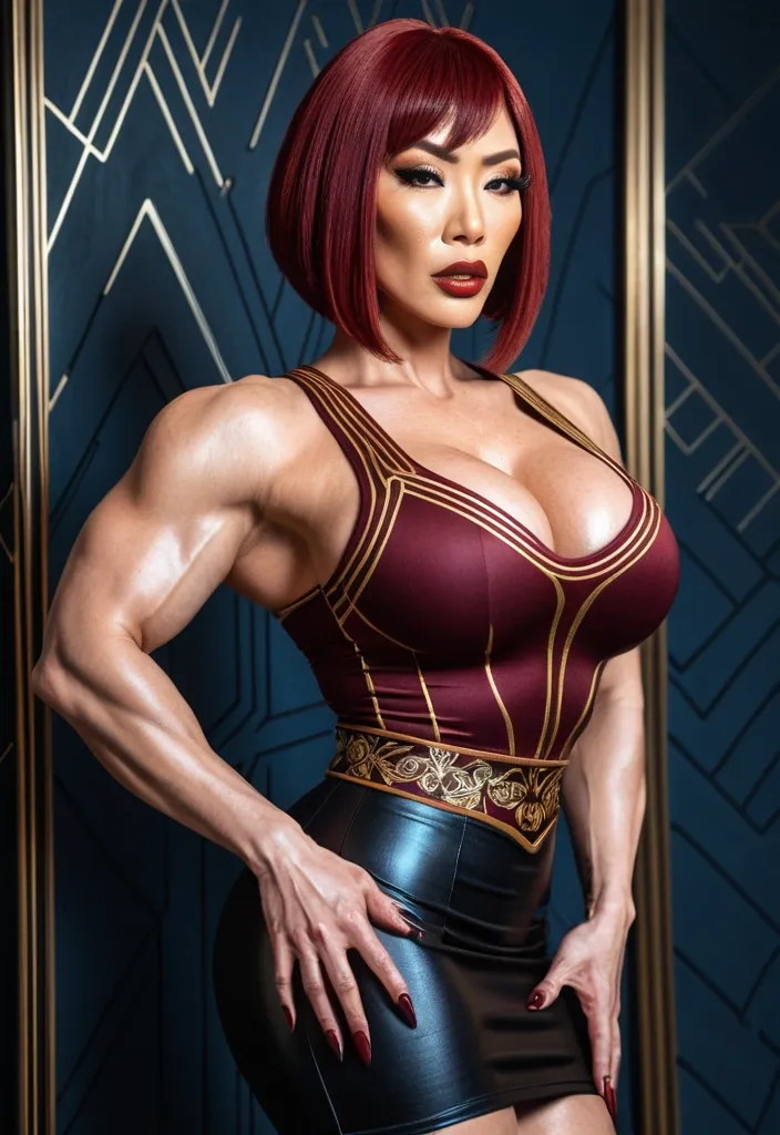 Generate Gorgeous female boss , bimbo , hourglass body , Japanese woman , abnormally massive female bodybuilder , gorgeous , close up , full lips , big booty , red hair , short bob-cut hair , , feminine silhouette , too big breast , big booty , sexy thighs abs , silhouette , up close , flexing biceps , beautiful brown eyes , legs are iconic and defining physical feature , both visually and in terms of combat ability.wearing an outfit that is a striking blend of elegance , power , and femininity , designed to command attention in any room. Outfit tailored to perfection , hugging the wearer’s curves with precision while emphasizing a structured silhouette. The fabric texture that feels both sophisticated and modern. The tank top features a luxurious touch that elevates the look beyond typical attire. The matching high-waisted shorts elongate the frame , further enhancing the poised and commanding effect of the ensemble.The styling choices amplify the boldness of the outfit. The outfit complements the tweed’s tone while introducing a softer , feminine balance to the sharp tailoring of the outfit. She is maintaining elegance without drawing focus away from the outfit commanding cut. Accessories are kept minimal yet intentional: a delicate layered gold necklace and hoop earrings that add glimmers of light and luxury without overpowering the outfit. The choice of voluminous , short bob-cut hair cascading down to her shoulders frames the face with both confidence and glamour , completing the commanding visual.Altogether , this look communicates a blend of authority and allure. It is fashion-forward , balancing corporate structure with vibrant femininity. The color palette blue tank top and grey short avoids being overly delicate , instead embracing the richness of texture , structure , and presence. This is the kind of ensemble that speaks to ambition , sophistication , and personal style—ideal for someone who thrives in positions of influence but insists on expressing her individuality with bold elegance. It’s not just clothing—it’s a statement of power wrapped in grace. In luxury living legs that could crush a cement block , she has a bold and striking statement piece , her big lips heart shaped lips in glossy red that gives them a sleek , polished finish. Adding both edge and detail to their design. The towering stiletto heel , paired with a thick platform sole , creates an ultra-dramatic silhouette that elongates the leg and exudes power and confidence. With their combination of shine , height , and structure , these boots perfectly balance fierce femininity with high-fashion allure. High cheekbones , prominent jawline , gorgeous big brown eyes , enormous breast , blue tank top Wearing a black gold and deep burgundy colored Pencil skirt and top , Art-deco lines , Thin gold trim , Subtle floral embroider , Satin / leather mix , enormous butt , powerful hips , ,