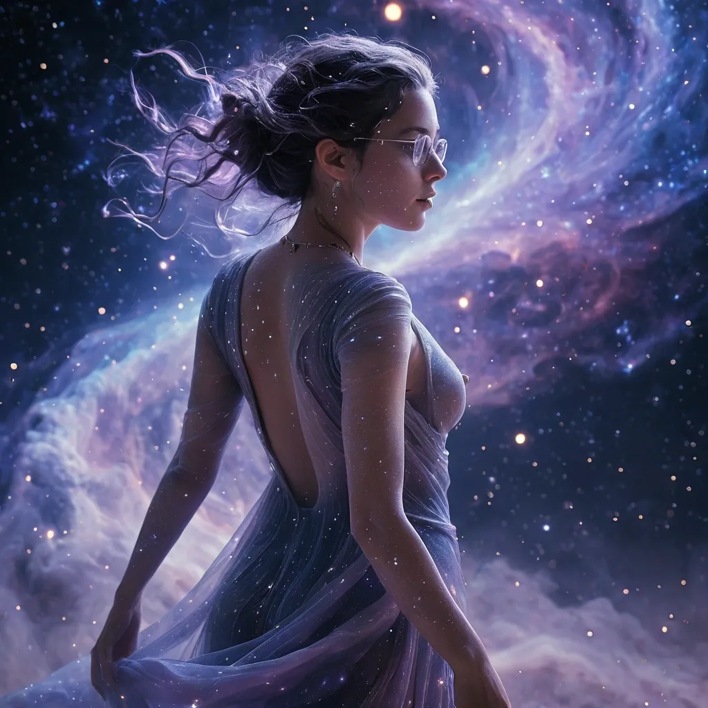 Ultra-detailed cinematic fantasy portrait of a confident woman standing in a vast galaxy environment filled with swirling nebula clouds , luminous constellations , drifting stardust , and deep cosmic blues , violets , and magentas. She stands sideways with graceful posture , her body angled away while she looks back over her shoulder toward the camera with a calm , powerful expression. Use the uploaded photo as facial reference. Preserve her natural face shape , eye spacing , nose structure , lip fullness , skin tone , and expression. Keep her glasses , necklace , and piercings visible. Maintain realistic skin texture and natural lighting. Her “dress” is formed entirely from living stardust and flowing nebula light. The cosmic material wraps and cascades around her like a celestial current , appearing organic and weightless rather than fabric. It glows softly and moves like illuminated mist , subtly revealing her silhouette beneath the shimmering layers without looking like clothing. Fine particles of light trail behind her as if gravity barely affects them. Highly detailed , sharp focus , soft cosmic glow , volumetric lighting , cinematic depth of field , radiant highlights , rich contrast , ethereal atmosphere , 8k resolution , professional fantasy photography style. ,