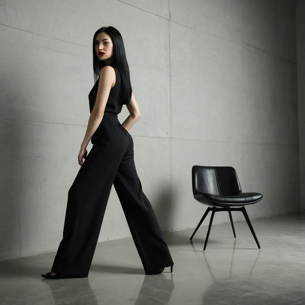 Full-body studio portrait of a woman with long , straight black hair and bold red lipstick , posing elegantly in a sophisticated black sleeveless jumpsuit with wide-leg trousers. She is seen from a low-angle perspective , standing with one foot on the floor and her other knee resting on a modern black Eames-style chair with wooden legs. She is wearing classic black high-heeled pumps. Her body is angled away from the camera while she looks back over her shoulder with a confident , serene expression. The background is a textured , minimalist concrete wall in a neutral grey tone , with soft directional studio lighting creating subtle shadows and highlights on the fabric. High-fashion photography style , sharp details , cinematic composition. ,