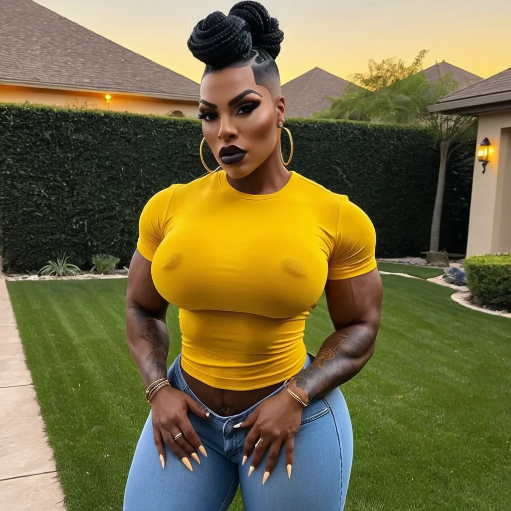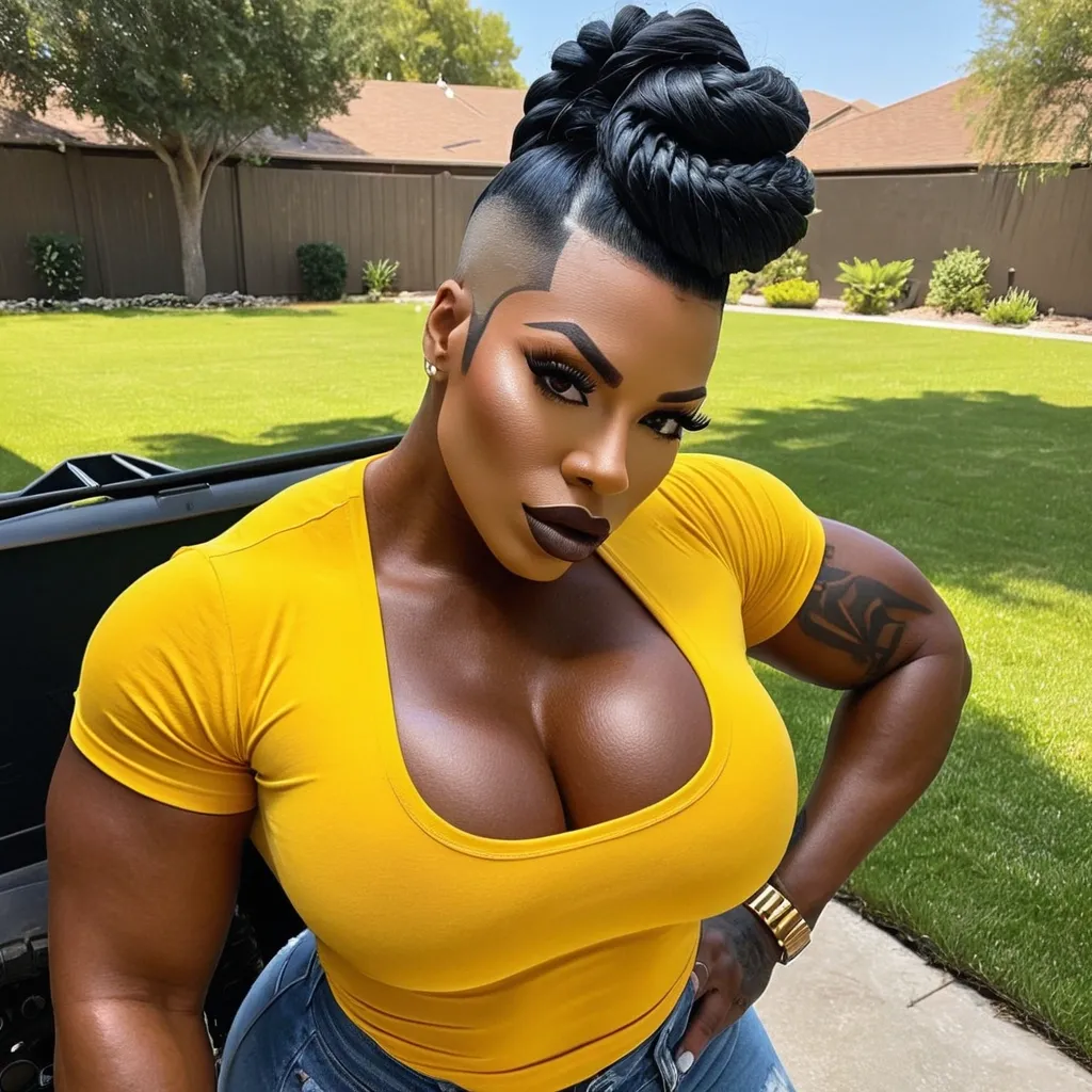 Generate Gorgeous female boss , bimbo , very dark-skinned very African-American female , hourglass body , abnormally massive female bodybuilder , gorgeous , close up , full lips , big booty , full plump lips , on face and breast , braided mohawk updo hair , black hair shaved on the side , feminine silhouette , too big breast , big booty , sexy thighs abs , silhouette , up close , flexing biceps , gorgeous light-reflecting hazel eyes , legs are iconic and defining physical feature , both visually and in terms of combat ability.wearing an outfit that is a striking blend of elegance , power , and femininity , designed to command attention in any room. The suit is tailored to perfection , hugging the wearer’s curves with precision while emphasizing a structured silhouette. The fabric itself is a refined grey tweed patterned with subtle white grid lines , giving the suit a texture that feels both sophisticated and modern. The blazer features broad blue lapels and gold button accents , adding a luxurious touch that elevates the look beyond typical business attire. The matching high-waisted trousers elongate the frame , further enhancing the poised and commanding effect of the ensemble.The styling choices amplify the boldness of the suit. The inner blouse is a silky , greybutton-down shirt that complements the tweed’s tone while introducing a softer , feminine balance to the sharp tailoring of the jacket. The blouse peeks out neatly from under the blazer , maintaining elegance without drawing focus away from the suit’s commanding cut. Accessories are kept minimal yet intentional: a delicate layered gold necklace and hoop earrings that add glimmers of light and luxury without overpowering the outfit. The choice of voluminous , honey-brown braids cascading down her shoulders frames the face with both confidence and glamour , completing the commanding visual.Altogether , this look communicates a blend of authority and allure. It is business-ready yet fashion-forward , balancing corporate structure with vibrant femininity. The color palette blue , grey and gold avoids being overly delicate , instead embracing the richness of texture , structure , and presence. This is the kind of ensemble that speaks to ambition , sophistication , and personal style—ideal for someone who thrives in positions of influence but insists on expressing her individuality with bold elegance. It’s not just clothing—it’s a statement of power wrapped in grace. In luxury living legs that could crush a watermelon , skirt high boots are a bold and striking statement piece , crafted in glossy black patent leather that gives them a sleek , polished finish. Rising to just below the knee , the boots feature three adjustable buckle straps along the shaft , adding both edge and detail to their design. The towering stiletto heel , paired with a thick platform sole , creates an ultra-dramatic silhouette that elongates the leg and exudes power and confidence. With their combination of shine , height , and structure , these boots perfectly balance fierce femininity with high-fashion allure. High cheekbones , prominent jawline , gorgeous big light reflecting hazel eyes , enormous breast , on yellow t-shirt-shirt , denim shorts , grilling in beautiful backyard ,