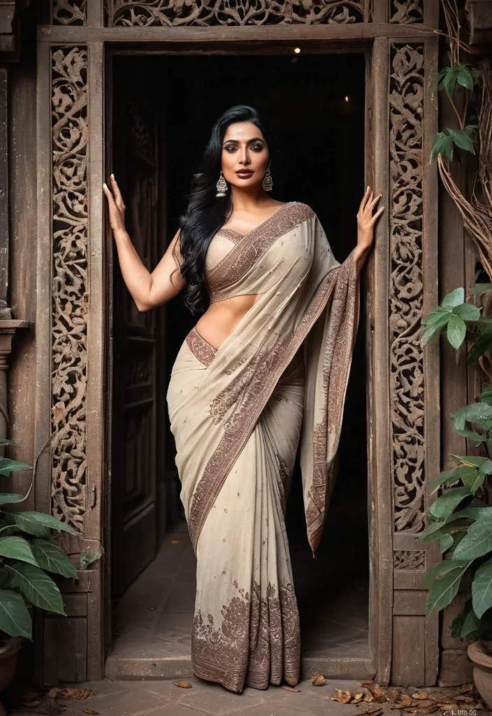 A breathtakingly beautiful , voluptuous , curvy Indian mature woman stands gracefully at the threshold of an abandoned wooden doorway , her full , curvaceous form draped in a soft , mud-toned Saree with intricate , time-worn patterns that hug her figure elegantly. Her glowing , dusky skin is smooth and radiant , framed by long , flowing black hair cascading over one shoulder. Her large , almond-shaped eyes are deep , enticing , and soulful , shimmering with a mysterious intensity that suggests a thousand untold stories. Her full lips rest in a faint , enigmatic smile , and her facial features are perfectly balanced with a natural , captivating charm. She gazes out with a thoughtful , almost longing expression. The aged wooden door behind her , with its rustic grain , weathered carvings of leaves and vines , and rusty hinges , forms a textured backdrop rich with history. The scene evokes a poetic blend of sensual beauty and timeless nostalgia , a quiet moment frozen between memory and desire. ,