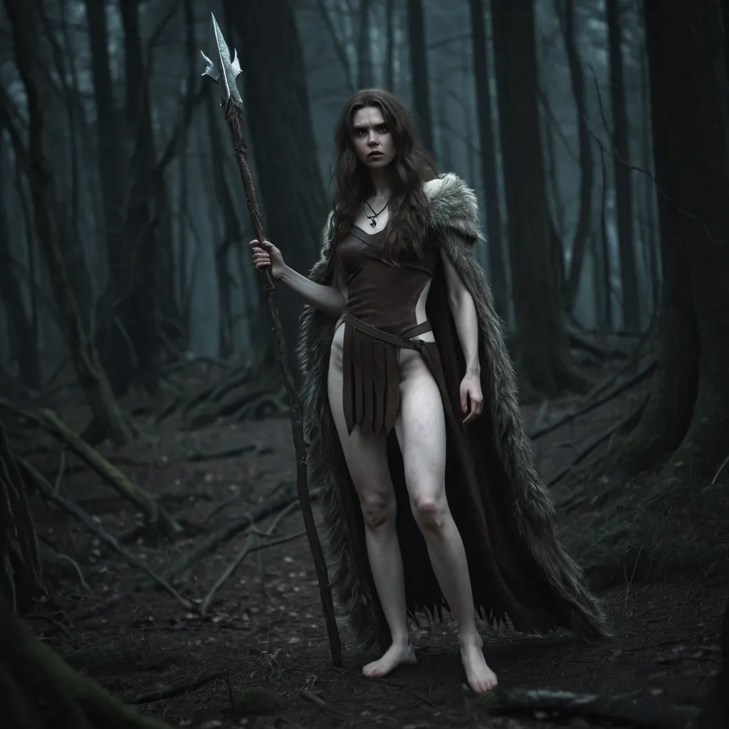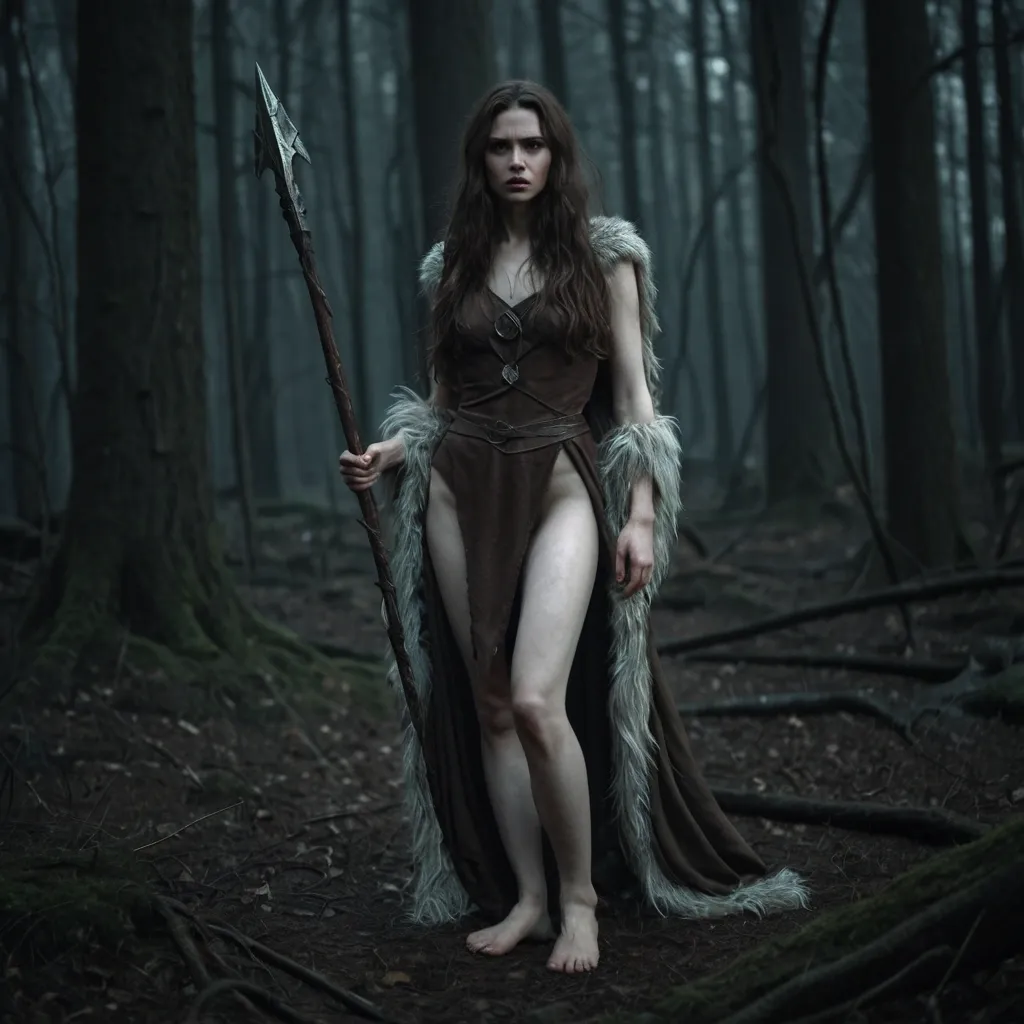 realistic elfic woman long wavy brown hair , pale skin , mid thirty , wearing short fur rags , barefoot standing in a dark malefic forest with a spear on hand , she looks upset , cinematic style ,