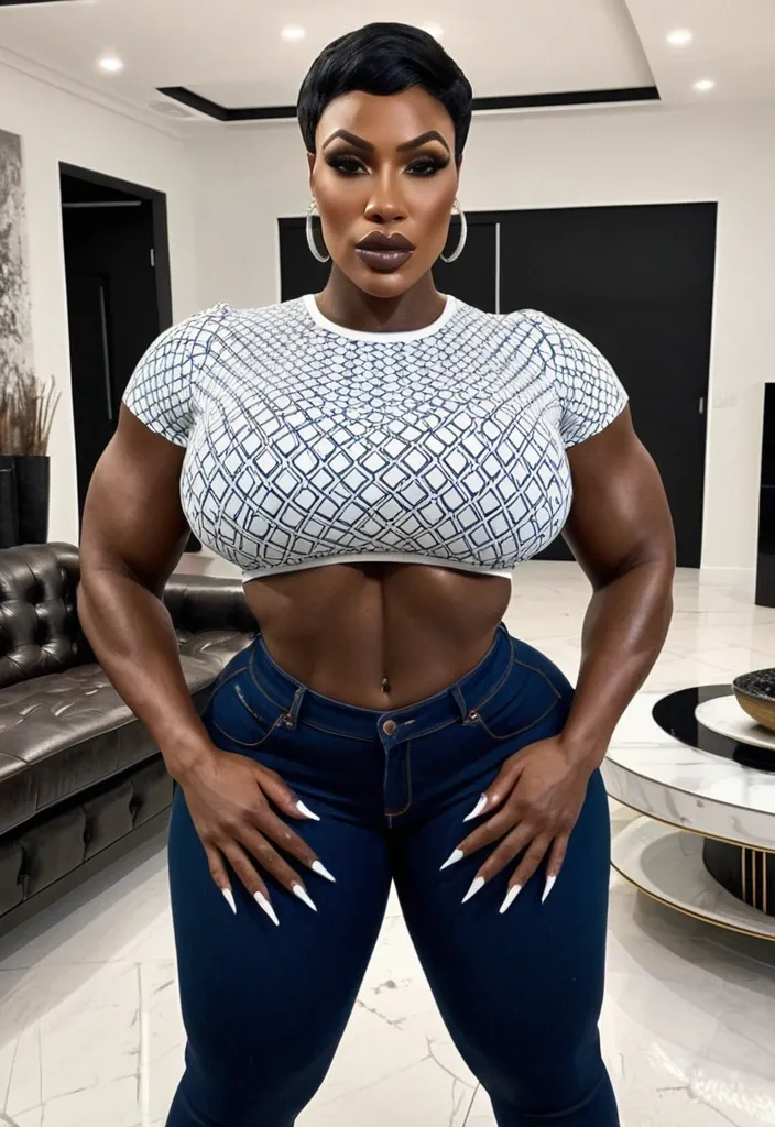 Generate Gorgeous female boss , bimbo , very dark-skinned African-American woman , short , pixie hair , hourglass body , abnormally massive female bodybuilder , gorgeous , close up , full lips , big booty , dark brown eyes , very big plump lips , feminine silhouette , too big breast , big booty , sexy thighs abs , silhouette , up close , flexing biceps , big gorgeous light brown eyes , legs are iconic and defining physical feature , both visually and in terms of combat ability.wearing an outfit that is a striking blend of elegance , power , and femininity , designed to command attention in any room. The suit is tailored to perfection , hugging the wearer’s curves with precision while emphasizing a structured silhouette. The fabric itself is a refined grey tweed patterned with subtle white grid lines , giving the suit a texture that feels both sophisticated and modern. The blazer features broad blue lapels and gold button accents , adding a luxurious touch that elevates the look beyond typical business attire. The matching high-waisted trousers elongate the frame , further enhancing the poised and commanding effect of the ensemble.The styling choices amplify the boldness of the suit. The inner blouse is a silky , greybutton-down shirt that complements the tweed’s tone while introducing a softer , feminine balance to the sharp tailoring of the jacket. The blouse peeks out neatly from under the blazer , maintaining elegance without drawing focus away from the suit’s commanding cut. Accessories are kept minimal yet intentional: a delicate layered gold necklace and hoop earrings that add glimmers of light and luxury without overpowering the outfit. The choice of voluminous , honey-brown braids cascading down her shoulders frames the face with both confidence and glamour , completing the commanding visual.Altogether , this look communicates a blend of authority and allure. It is business-ready yet fashion-forward , balancing corporate structure with vibrant femininity. The color palette blue , grey and gold avoids being overly delicate , instead embracing the richness of texture , structure , and presence. This is the kind of ensemble that speaks to ambition , sophistication , and personal style—ideal for someone who thrives in positions of influence but insists on expressing her individuality with bold elegance. It’s not just clothing—it’s a statement of power wrapped in grace. In luxury living legs that could crush a watermelon , skirt high boots are a bold and striking statement piece , crafted in glossy black patent leather that gives them a sleek , polished finish. Rising to just below the knee , the boots feature three adjustable buckle straps along the shaft , adding both edge and detail to their design. The towering stiletto heel , paired with a thick platform sole , creates an ultra-dramatic silhouette that elongates the leg and exudes power and confidence. With their combination of shine , height , and structure , these boots perfectly balance fierce femininity with high-fashion allure. Massive breast , massive cleavage , driving and standing in living room , wearing a white , dark navy blue and black accented subtle symmetrical patterned t-shirt , black denim pants , enormous butt ,