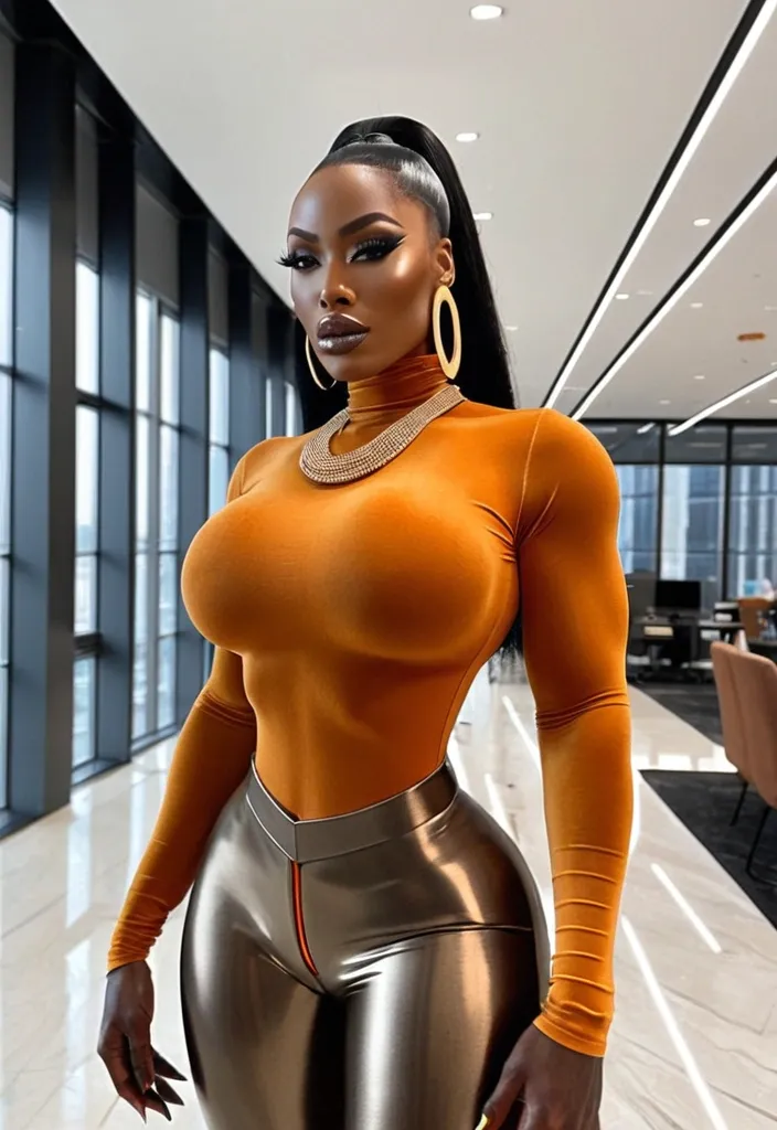 Generate Gorgeous 24 years old , female boss , dark-skinned African-American woman , pointy face , bimbo , hourglass body , abnormally massive female bodybuilder , gorgeous , close up , full lips , big booty , short stylish futuristic mini afro , feminine silhouette , too big breast , big booty , sexy thighs abs , silhouette , up close , flexing biceps , beautiful brown eyes , legs are iconic and defining physical feature , both visually and in terms of combat ability.wearing an outfit that is a striking blend of elegance , power , and femininity , designed to command attention in any room. The suit is tailored to perfection , hugging the wearer’s curves with precision while emphasizing a structured silhouette. The fabric itself is a refined grey tweed patterned with subtle white grid lines , giving the suit a texture that feels both sophisticated and modern. The blazer features broad blue lapels and gold button accents , adding a luxurious touch that elevates the look beyond typical business attire. The matching high-waisted trousers elongate the frame , further enhancing the poised and commanding effect of the ensemble.The styling choices amplify the boldness of the suit. The inner blouse is a silky , greybutton-down shirt that complements the tweed’s tone while introducing a softer , feminine balance to the sharp tailoring of the jacket. The blouse peeks out neatly from under the blazer , maintaining elegance without drawing focus away from the suit’s commanding cut. Accessories are kept minimal yet intentional: a delicate layered gold necklace and hoop earrings that add glimmers of light and luxury without overpowering the outfit. The choice of voluminous , honey-brown braids cascading down her shoulders frames the face with both confidence and glamour , completing the commanding visual.Altogether , this look communicates a blend of authority and allure. It is business-ready yet fashion-forward , balancing corporate structure with vibrant femininity. The color palette blue , grey and gold avoids being overly delicate , instead embracing the richness of texture , structure , and presence. This is the kind of ensemble that speaks to ambition , sophistication , and personal style—ideal for someone who thrives in positions of influence but insists on expressing her individuality with bold elegance. It’s not just clothing—it’s a statement of power wrapped in grace. In luxury living legs that could crush a watermelon , skirt high boots are a bold and striking statement piece , crafted in glossy black patent leather that gives them a sleek , polished finish. Rising to just below the knee , the boots feature three adjustable buckle straps along the shaft , adding both edge and detail to their design. The towering stiletto heel , paired with a thick platform sole , creates an ultra-dramatic silhouette that elongates the leg and exudes power and confidence. With their combination of shine , height , and structure , these boots perfectly balance fierce femininity with high-fashion allure. High cheekbones , prominent jawline , gorgeous big brown light hazel honey , , enormous breast , orange velvet t-shirt , gold futuristic necklace , grey designer pants in office building ,