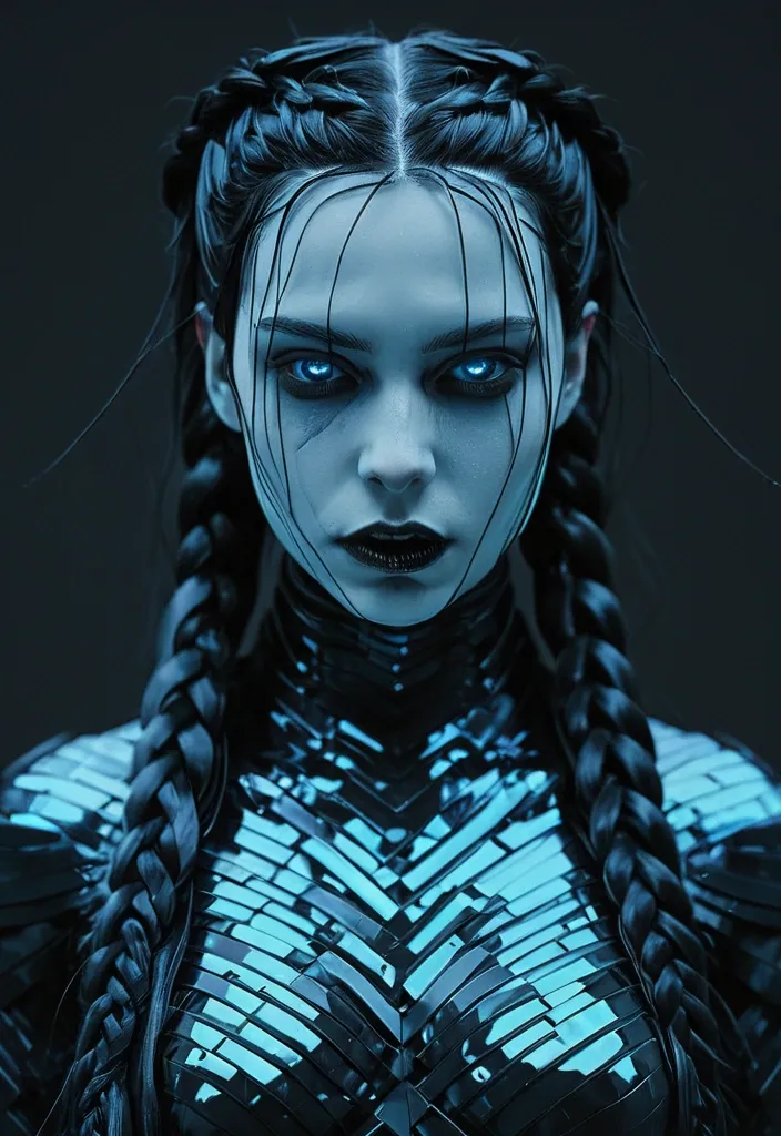 A hyper-detailed portrait of a female vampire figure , pale blue iridescent skin , monochromatic black , jet black hair in thick braids , subtle glitch art interference , data-mosh textures on the shoulders , cold artificial lighting , deep blue shadows , minimalist futuristic tribalism , sharp focus on the eyes ,