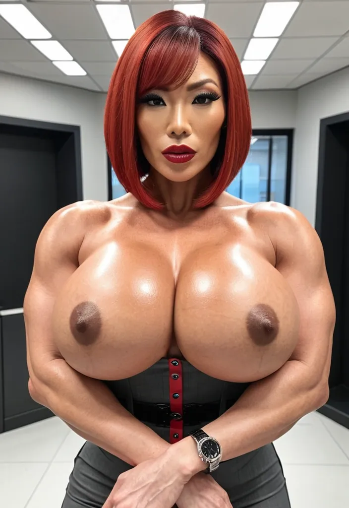 Generate Gorgeous female boss , bimbo , Japanese woman , , hourglass body , abnormally massive female bodybuilder , gorgeous , close up , full lips , big booty , red hair , bob-cut , short hair , feminine silhouette , too big breast , big booty , sexy thighs abs , silhouette , up close , flexing biceps , beautiful brown eyes , legs are iconic and defining physical feature , both visually and in terms of combat ability.wearing an outfit that is a striking blend of elegance , power , and femininity , designed to command attention in any room. The suit is tailored to perfection , hugging the wearer’s curves with precision while emphasizing a structured silhouette. The fabric itself is a refined grey tweed patterned with subtle white grid lines , giving the suit a texture that feels both sophisticated and modern. The blazer features broad blue lapels and gold button accents , adding a luxurious touch that elevates the look beyond typical business attire. The matching high-waisted trousers elongate the frame , further enhancing the poised and commanding effect of the ensemble.The styling choices amplify the boldness of the suit. The inner blouse is a silky , greybutton-down shirt that complements the tweed’s tone while introducing a softer , feminine balance to the sharp tailoring of the jacket. The blouse peeks out neatly from under the blazer , maintaining elegance without drawing focus away from the suit’s commanding cut. Accessories are kept minimal yet intentional: a delicate layered gold necklace and hoop earrings that add glimmers of light and luxury without overpowering the outfit. The choice of voluminous , honey-brown braids cascading down her shoulders frames the face with both confidence and glamour , completing the commanding visual.Altogether , this look communicates a blend of authority and allure. It is business-ready yet fashion-forward , balancing corporate structure with vibrant femininity. The color palette blue , grey and gold avoids being overly delicate , instead embracing the richness of texture , structure , and presence. This is the kind of ensemble that speaks to ambition , sophistication , and personal style—ideal for someone who thrives in positions of influence but insists on expressing her individuality with bold elegance. It’s not just clothing—it’s a statement of power wrapped in grace. In luxury living legs that could crush a watermelon , skirt high boots are a bold and striking statement piece , crafted in glossy black patent leather that gives them a sleek , polished finish. Rising to just below the knee , the boots feature three adjustable buckle straps along the shaft , adding both edge and detail to their design. The towering stiletto heel , paired with a thick platform sole , creates an ultra-dramatic silhouette that elongates the leg and exudes power and confidence. With their combination of shine , height , and structure , these boots perfectly balance fierce femininity with high-fashion allure. High cheekbones , prominent jawline , gorgeous big enormous breast , enormous butt , up close massive cleavageHer Arms are held close to her body , under her chest at supporting her enormous breast , arms folded under chest , red , gray , and black accent , Oxford dress t-shirt with gray slacks in a police station ,