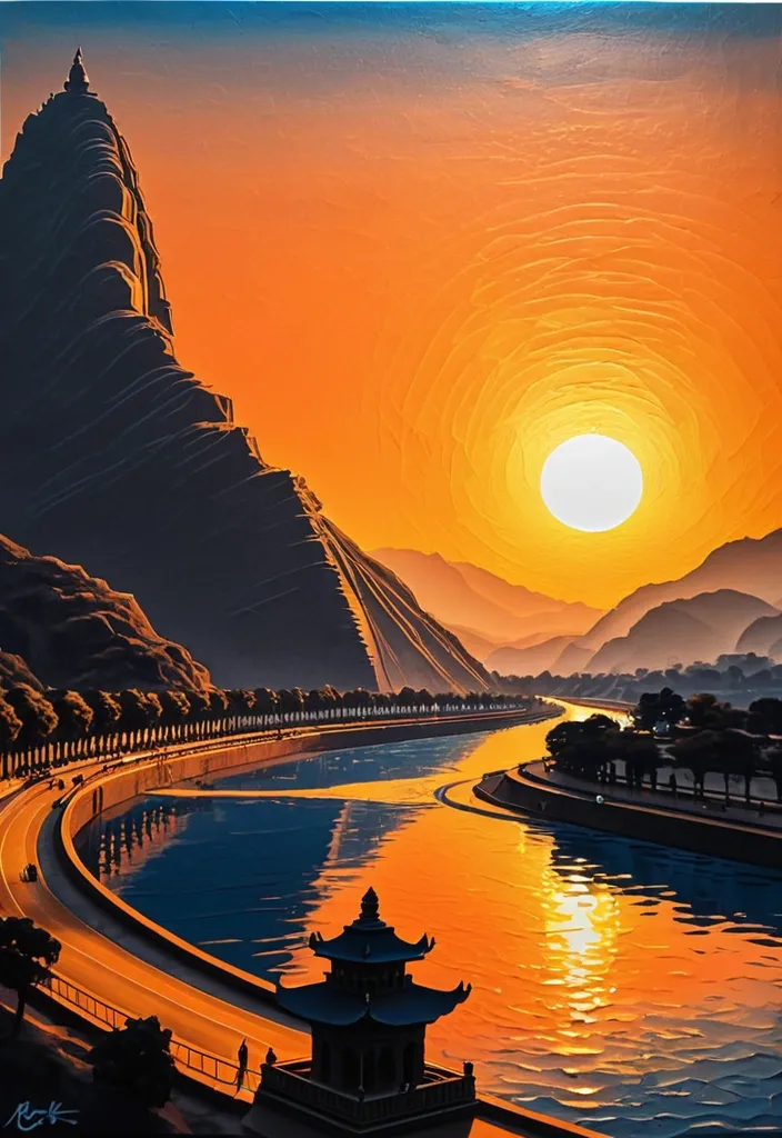 A Sacred Fig , seemingly in the act of painting , traces a fine , elegant curve from the lower left to the upper right. Within the stroke are miniature landscapes of famous Statue of Unity landmarks: world's tallest statue , located at bank of Narmada river as focal point , the crowds and neon lights , the iconic natural mountains , some tiny people enjoy in zoo and garden , buses and vehicles on road , dams on river , the reflection of the Narmada River and its gentle ripples , and in the distance , the silhouette of mountains under the setting sun (a distant view , subtly depicted). The overall style is a combination of impasto (oil painting style) and academic poster design: varying brushstrokes create a sense of three-dimensionality , with 3D miniature landscapes and a bas-relief texture. Warm orange-red and gold tones dominate (sunset , lantern light , warm neon light) , with architecture interspersed with the modern Statue of Unity. The image is a minimalist top-down view , with large areas of black space outside the handwriting. The background is a blue to black gradient textured paper (high-quality fiber texture). The overall design blends traditional natural aesthetics with modern three-dimensional art , featuring high detail , hyper-realism , HDR , and 8K resolution. ,