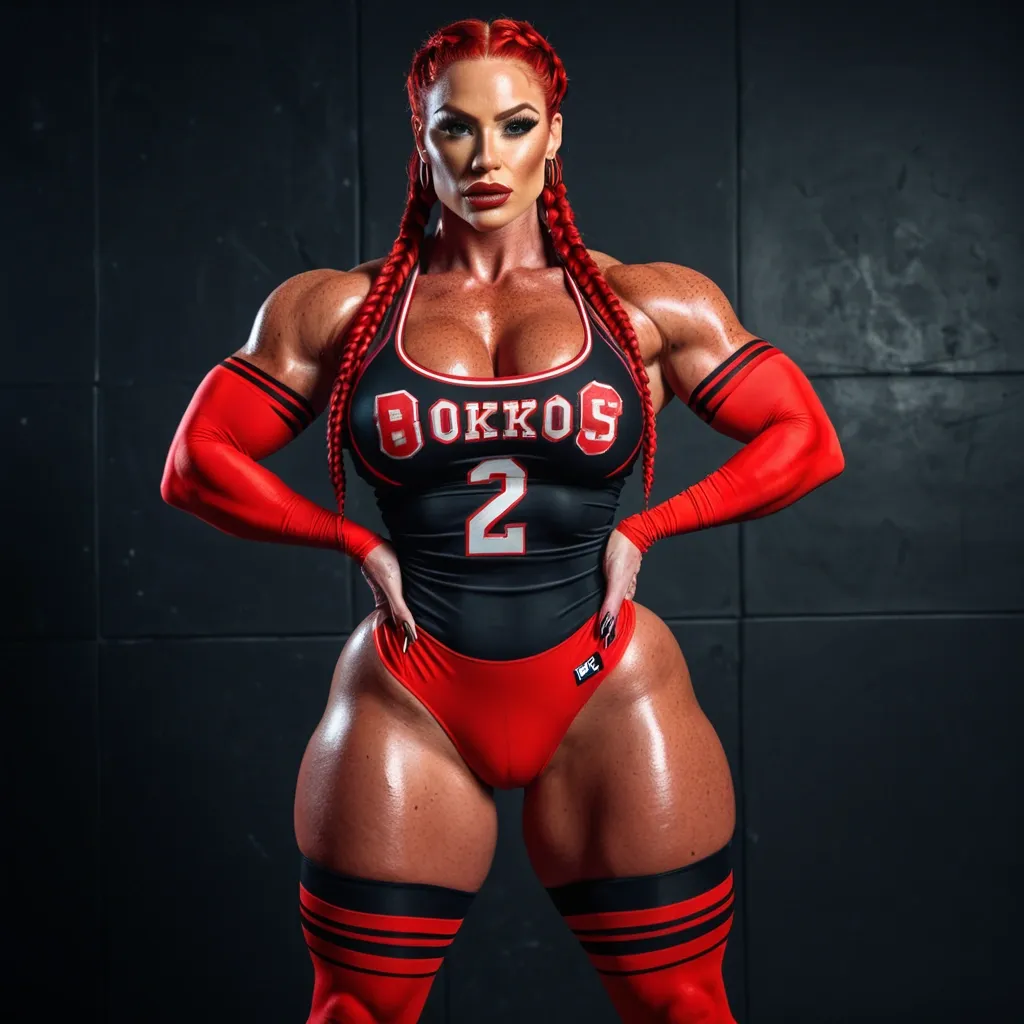 Generate Gorgeous female boss , bimbo , hourglass body , abnormally massive female bodybuilder , gorgeous , close up , full lips , big booty , redheaded , freckles on face and breast , braided design hair , feminine silhouette , too big breast , big booty , sexy thighs abs , silhouette , up close , flexing biceps , beautiful green eyes , legs are iconic and defining physical feature , both visually and in terms of combat ability.wearing an outfit that is a striking blend of elegance , power , and femininity , designed to command attention in any room. The suit is tailored to perfection , hugging the wearer’s curves with precision while emphasizing a structured silhouette. The fabric itself is a refined grey tweed patterned with subtle white grid lines , giving the suit a texture that feels both sophisticated and modern. The blazer features broad blue lapels and gold button accents , adding a luxurious touch that elevates the look beyond typical business attire. The matching high-waisted trousers elongate the frame , further enhancing the poised and commanding effect of the ensemble.The styling choices amplify the boldness of the suit. The inner blouse is a silky , greybutton-down shirt that complements the tweed’s tone while introducing a softer , feminine balance to the sharp tailoring of the jacket. The blouse peeks out neatly from under the blazer , maintaining elegance without drawing focus away from the suit’s commanding cut. Accessories are kept minimal yet intentional: a delicate layered gold necklace and hoop earrings that add glimmers of light and luxury without overpowering the outfit. The choice of voluminous , honey-brown braids cascading down her shoulders frames the face with both confidence and glamour , completing the commanding visual.Altogether , this look communicates a blend of authority and allure. It is business-ready yet fashion-forward , balancing corporate structure with vibrant femininity. The color palette blue , grey and gold avoids being overly delicate , instead embracing the richness of texture , structure , and presence. This is the kind of ensemble that speaks to ambition , sophistication , and personal style—ideal for someone who thrives in positions of influence but insists on expressing her individuality with bold elegance. It’s not just clothing—it’s a statement of power wrapped in grace. In luxury living legs that could crush a watermelon , skirt high boots are a bold and striking statement piece , crafted in glossy black patent leather that gives them a sleek , polished finish. Rising to just below the knee , the boots feature three adjustable buckle straps along the shaft , adding both edge and detail to their design. The towering stiletto heel , paired with a thick platform sole , creates an ultra-dramatic silhouette that elongates the leg and exudes power and confidence. With their combination of shine , height , and structure , these boots perfectly balance fierce femininity with high-fashion allure. Wearing Black and red basketball jersey with the number 26 , full body shot ,