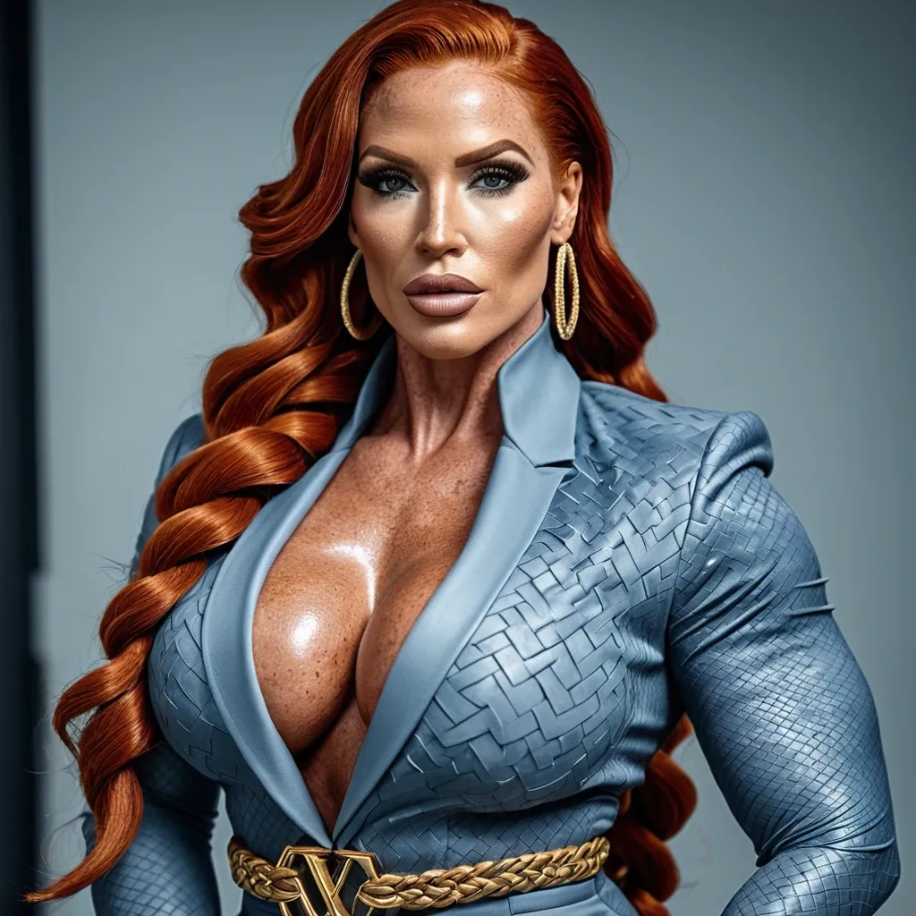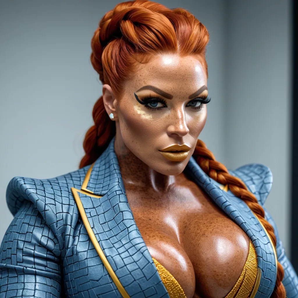 Generate Gorgeous female boss , bimbo , hourglass body , abnormally massive female bodybuilder , gorgeous , close up , full lips , big booty , redheaded , freckles on face and breast , braided design hair , feminine silhouette , too big breast , big booty , sexy thighs abs , silhouette , up close , flexing biceps , beautiful green eyes , legs are iconic and defining physical feature , both visually and in terms of combat ability.wearing an outfit that is a striking blend of elegance , power , and femininity , designed to command attention in any room. The suit is tailored to perfection , hugging the wearer’s curves with precision while emphasizing a structured silhouette. The fabric itself is a refined grey tweed patterned with subtle white grid lines , giving the suit a texture that feels both sophisticated and modern. The blazer features broad blue lapels and gold button accents , adding a luxurious touch that elevates the look beyond typical business attire. The matching high-waisted trousers elongate the frame , further enhancing the poised and commanding effect of the ensemble.The styling choices amplify the boldness of the suit. The inner blouse is a silky , greybutton-down shirt that complements the tweed’s tone while introducing a softer , feminine balance to the sharp tailoring of the jacket. The blouse peeks out neatly from under the blazer , maintaining elegance without drawing focus away from the suit’s commanding cut. Accessories are kept minimal yet intentional: a delicate layered gold necklace and hoop earrings that add glimmers of light and luxury without overpowering the outfit. The choice of voluminous , honey-brown braids cascading down her shoulders frames the face with both confidence and glamour , completing the commanding visual.Altogether , this look communicates a blend of authority and allure. It is business-ready yet fashion-forward , balancing corporate structure with vibrant femininity. The color palette blue , grey and gold avoids being overly delicate , instead embracing the richness of texture , structure , and presence. This is the kind of ensemble that speaks to ambition , sophistication , and personal style—ideal for someone who thrives in positions of influence but insists on expressing her individuality with bold elegance. It’s not just clothing—it’s a statement of power wrapped in grace. ,