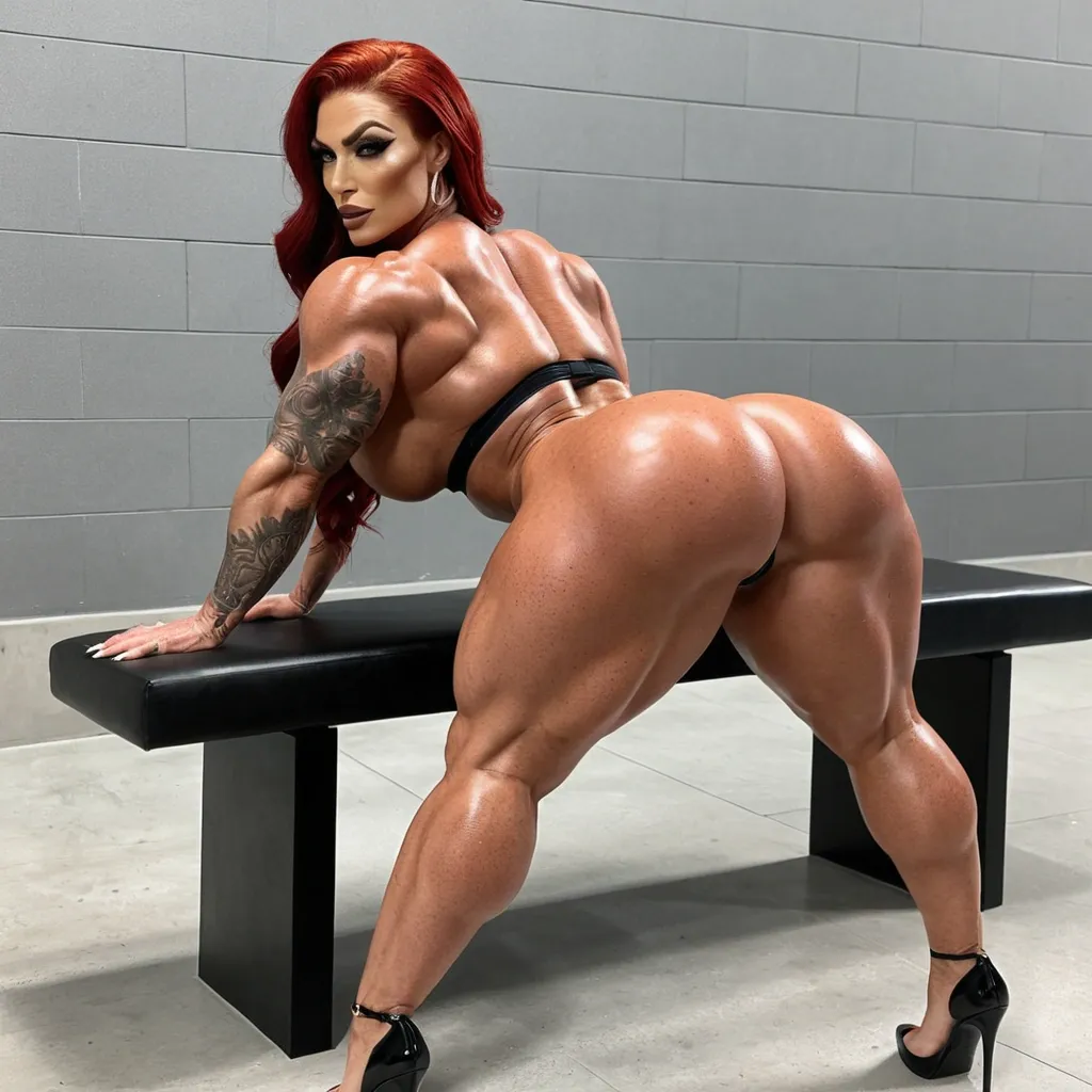Generate Gorgeous female boss , bimbo , hourglass body , abnormally massive female bodybuilder , gorgeous , close up , full lips , big booty , redheaded , freckles on face and breast , braided design hair , feminine silhouette , too big breast , big booty , sexy thighs abs , silhouette , up close , flexing biceps , beautiful green eyes , legs are iconic and defining physical feature , both visually and in terms of combat ability.wearing an outfit that is a striking blend of elegance , power , and femininity , designed to command attention in any room. The suit is tailored to perfection , hugging the wearer’s curves with precision while emphasizing a structured silhouette. The fabric itself is a refined grey tweed patterned with subtle white grid lines , giving the suit a texture that feels both sophisticated and modern. The blazer features broad blue lapels and gold button accents , adding a luxurious touch that elevates the look beyond typical business attire. The matching high-waisted trousers elongate the frame , further enhancing the poised and commanding effect of the ensemble.The styling choices amplify the boldness of the suit. The inner blouse is a silky , greybutton-down shirt that complements the tweed’s tone while introducing a softer , feminine balance to the sharp tailoring of the jacket. The blouse peeks out neatly from under the blazer , maintaining elegance without drawing focus away from the suit’s commanding cut. Accessories are kept minimal yet intentional: a delicate layered gold necklace and hoop earrings that add glimmers of light and luxury without overpowering the outfit. The choice of voluminous , honey-brown braids cascading down her shoulders frames the face with both confidence and glamour , completing the commanding visual.Altogether , this look communicates a blend of authority and allure. It is business-ready yet fashion-forward , balancing corporate structure with vibrant femininity. The color palette blue , grey and gold avoids being overly delicate , instead embracing the richness of texture , structure , and presence. This is the kind of ensemble that speaks to ambition , sophistication , and personal style—ideal for someone who thrives in positions of influence but insists on expressing her individuality with bold elegance. It’s not just clothing—it’s a statement of power wrapped in grace. In luxury living legs that could crush a watermelon , skirt high boots are a bold and striking statement piece , crafted in glossy black patent leather that gives them a sleek , polished finish. Rising to just below the knee , the boots feature three adjustable buckle straps along the shaft , adding both edge and detail to their design. The towering stiletto heel , paired with a thick platform sole , creates an ultra-dramatic silhouette that elongates the leg and exudes power and confidence. With their combination of shine , height , and structure , these boots perfectly balance fierce femininity with high-fashion allure. , She is positioned on all fours , with her knees on the bench and her hands placed in front of her for support. Her back is slightly arched and her upper body leans forward , creating a smooth curve through her torso and emphasizing her hips. This pose highlights her lower body and projects a confident , sensual stance while maintaining balance and control. ,