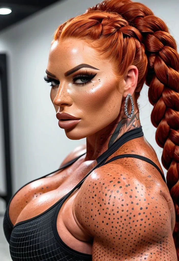 Generate Gorgeous female boss , bimbo , hourglass body , abnormally massive female bodybuilder , gorgeous , close up , full lips , big booty , redheaded , freckles on face and breast , braided design hair , feminine silhouette , too big breast , big booty , sexy thighs abs , silhouette , up close , flexing biceps , beautiful green eyes , legs are iconic and defining physical feature , both visually and in terms of combat ability.wearing an outfit that is a striking blend of elegance , power , and femininity , designed to command attention in any room. The suit is tailored to perfection , hugging the wearer’s curves with precision while emphasizing a structured silhouette. The fabric itself is a refined grey tweed patterned with subtle white grid lines , giving the suit a texture that feels both sophisticated and modern. The blazer features broad blue lapels and gold button accents , adding a luxurious touch that elevates the look beyond typical business attire. The matching high-waisted trousers elongate the frame , further enhancing the poised and commanding effect of the ensemble.The styling choices amplify the boldness of the suit. The inner blouse is a silky , greybutton-down shirt that complements the tweed’s tone while introducing a softer , feminine balance to the sharp tailoring of the jacket. The blouse peeks out neatly from under the blazer , maintaining elegance without drawing focus away from the suit’s commanding cut. Accessories are kept minimal yet intentional: a delicate layered gold necklace and hoop earrings that add glimmers of light and luxury without overpowering the outfit. The choice of voluminous , honey-brown braids cascading down her shoulders frames the face with both confidence and glamour , completing the commanding visual.Altogether , this look communicates a blend of authority and allure. It is business-ready yet fashion-forward , balancing corporate structure with vibrant femininity. The color palette blue , grey and gold avoids being overly delicate , instead embracing the richness of texture , structure , and presence. This is the kind of ensemble that speaks to ambition , sophistication , and personal style—ideal for someone who thrives in positions of influence but insists on expressing her individuality with bold elegance. It’s not just clothing—it’s a statement of power wrapped in grace. In luxury living legs that could crush a watermelon , skirt high boots are a bold and striking statement piece , crafted in glossy black patent leather that gives them a sleek , polished finish. Rising to just below the knee , the boots feature three adjustable buckle straps along the shaft , adding both edge and detail to their design. The towering stiletto heel , paired with a thick platform sole , creates an ultra-dramatic silhouette that elongates the leg and exudes power and confidence. With their combination of shine , height , and structure , these boots perfectly balance fierce femininity with high-fashion allure , white t-shirt , and blue jean shorts in barbershop , freckles , ginger hair , enormous butt , enormous breast , ,