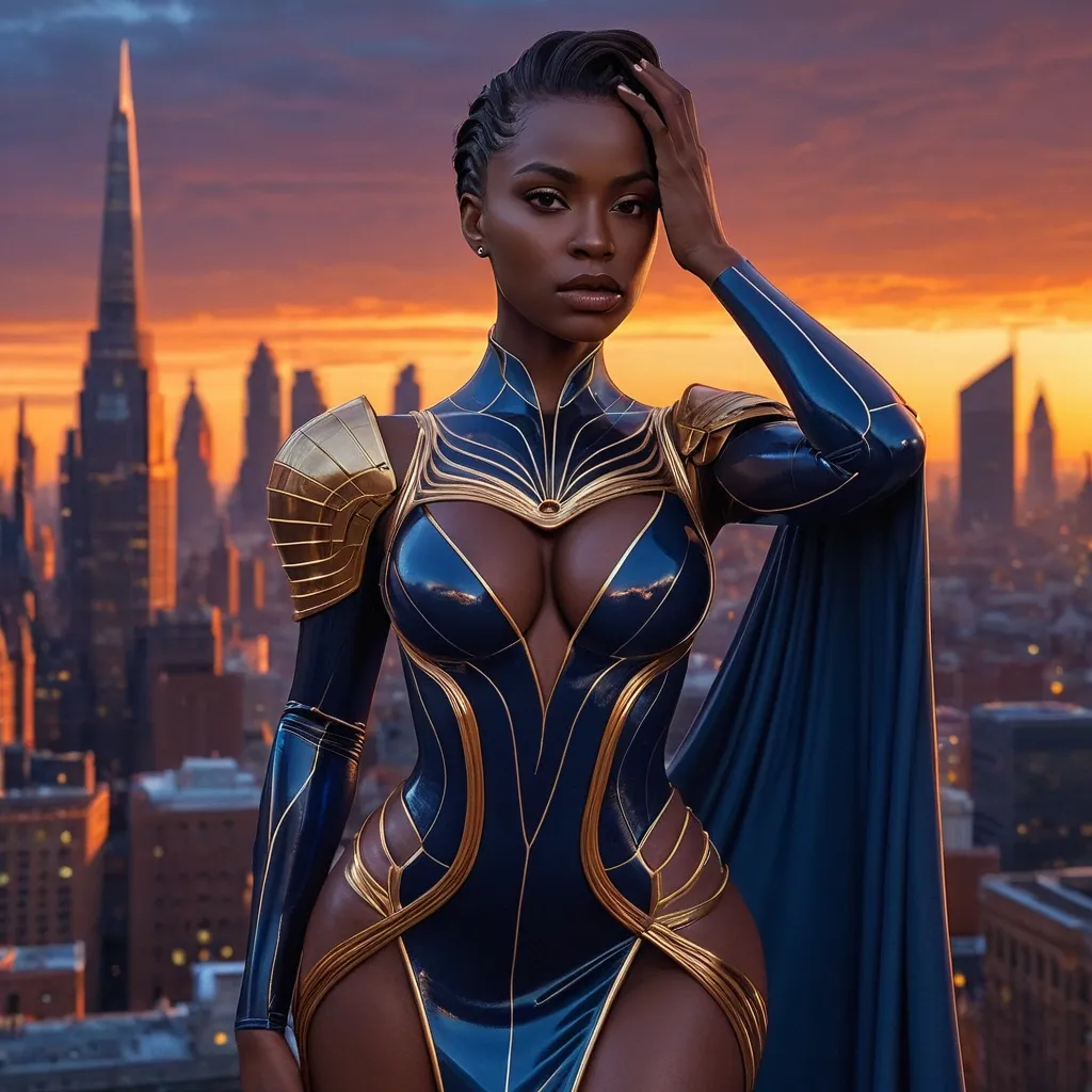 Gorgeous , bimbo , full lips , dark-skinned African-American woman with a pointy face and gorgeous hazel eyes She stands like a woman carved from resolve itself—chin lifted , shoulders squared , one hand rising confidently toward her temple as though she’s adjusting a thought , not a hairstyle. Her face is sharp , elegant , and commanding , with a pointed structure that catches the light just right. Her hazel eyes glow with that rare mix of warmth and warning—beautiful , but not to be underestimated. Her skin is a deep , lustrous brown , smooth and radiant under the dramatic lighting.Her dress is a masterpiece of futuristic craftsmanship: a deep navy material molded almost like living armor , traced with intricate gold lines that flow along her curves like circuitry and constellations. The design exaggerates her strength—broad shoulders , sculpted torso , powerful hips—yet does it with grace. The sleeves drape in long , regal waves , contrasting the tight , body-shaped bodice that shows off every bit of her athletic form. It’s both a gown and a battle standard.Behind her rises a glowing city of towering spires , bathed in warm twilight and cool neon. The sky burns orange at the horizon , while blue highlights shimmer along the buildings like veins of energy. She stands centered against it all , steady and unshaken—like the whole skyline is leaning in to listen to her next move. , enormous breast , enormous butt ,