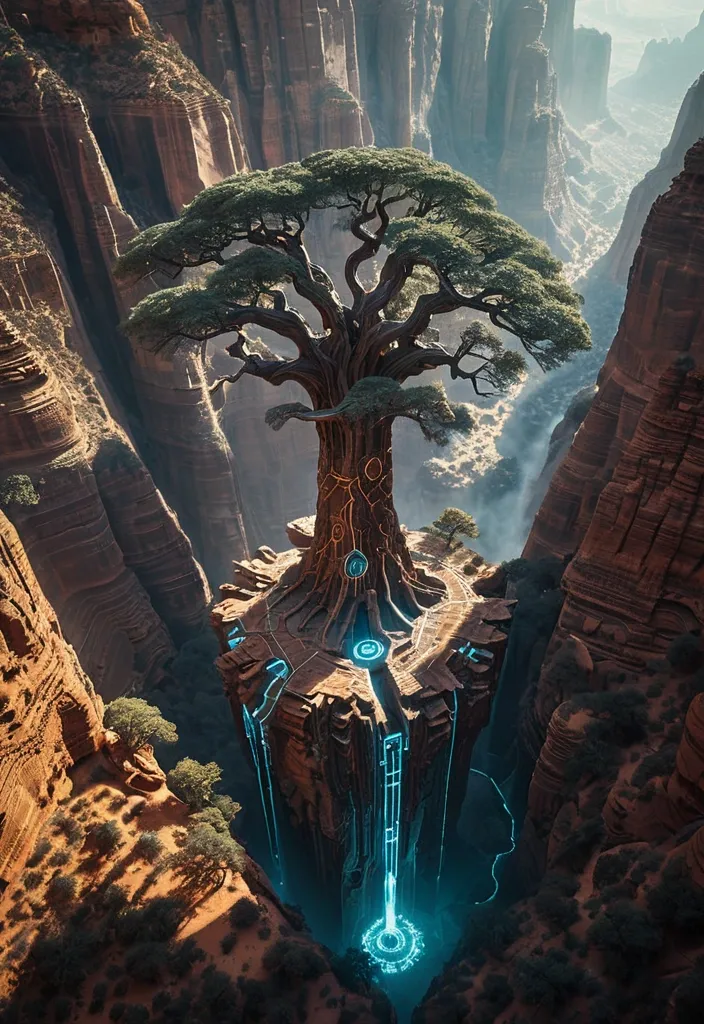 A colossal ancient tree with circuitry patterns embedded in its bark , its roots reaching into a vast , unexplored canyon system bathed in ethereal light. A single , small drone hovers near the canopy , surveying the scene. The image should evoke a sense of awe and mystery , blending natural grandeur with advanced , ancient technology. Shot with a wide-angle cinematic lens , capturing the immense scale and atmospheric depth , reminiscent of fantasy concept art. ,