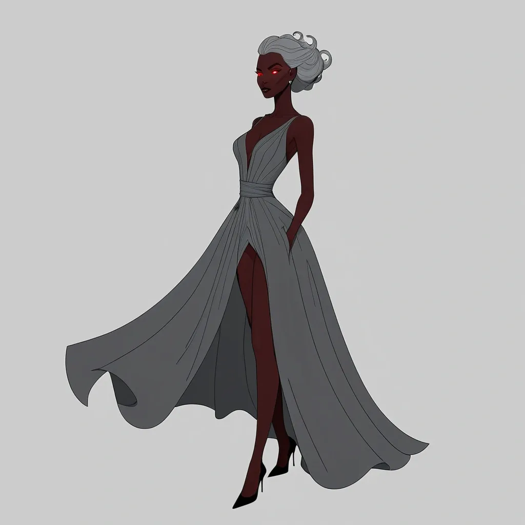 STYLE: Flat Action Fantasy (Simplified) — clean line art , flat colors , minimal shading , elegant silhouette , subtle movement in hair. Lumi is a slim , elegant vampire woman with dark skin that has a pale gray undertone. Her red eyes are simple and expressive , without glow. Her hair: long , dark , flowing , but with large smooth shapes , not too many individual strands. Her outfit: sensual but minimal — a simple dress with a few flowing shapes , no lace , no small folds , no micro-details. Silhouette: graceful , smooth curves , very animation-friendly. Mood: mysterious , adult , elegant. ,