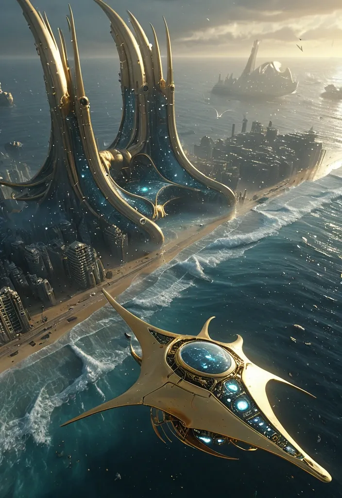 Cinematic aerial view over a futuristic oceanic metropolis. A colossal bio-mechanical manta-ray , its form a fusion of glass-like polymers curves and motherboard texture with CCTVs camera plating , glides through a nebula of swirling stardust and gas clouds. Intricate gold , silver , and chrome-plated components are embedded throughout its body , pulsing with soft , internal light. The scene is rendered with hyper-realistic detail , emphasizing the vastness of ocean and the majestic , ocean nature of the creature. Late afternoon light. Golden reflections on the facades. Humid atmosphere , light saline mist. Distant seagulls. Gentle waves lapping against the structures. 70mm optics. Realistic depth of field. Photorealistic live-action rendering. Credible physical textures. No UI elements. No game graphics. Organic and functional futuristic architecture ,