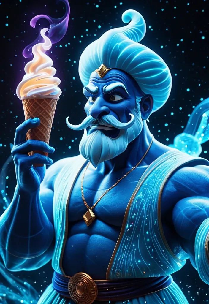 A flowing , tiny Genie-like (a fictional character who appeared in Walt Disney Pictures' animated film Aladdin) , holding a iPhone taking selfie , emerging from a ice cream cone. The Genie is composed entirely of soft , bioluminescent at the head and shoulders , shifting into bright cyan. Style: Celestial , ethereal , abstract , digital art smoking: Dramatic backlighting , bright glowing particles , contrasting dark background Composition: dynamic diagonal composition , upward gaze Details: Sparkling white waves and smoke , streaking white light trails , sense of movement and wonder , magical atmosphere Quality: High detail , 4K , Masterpiece , Rendered in Octane ,